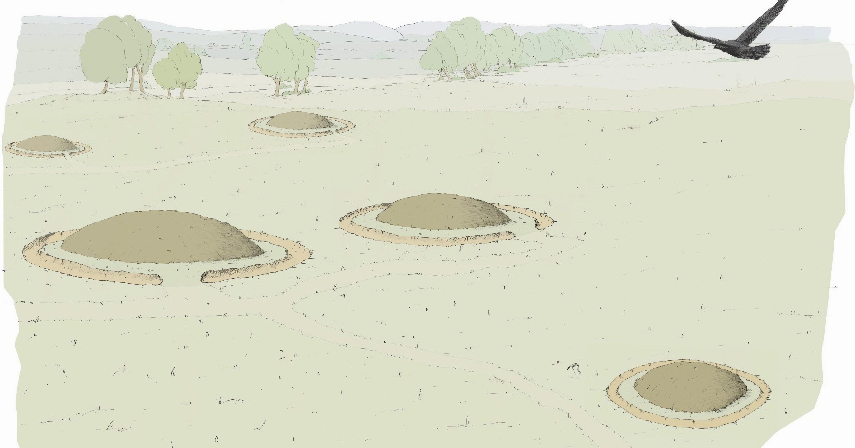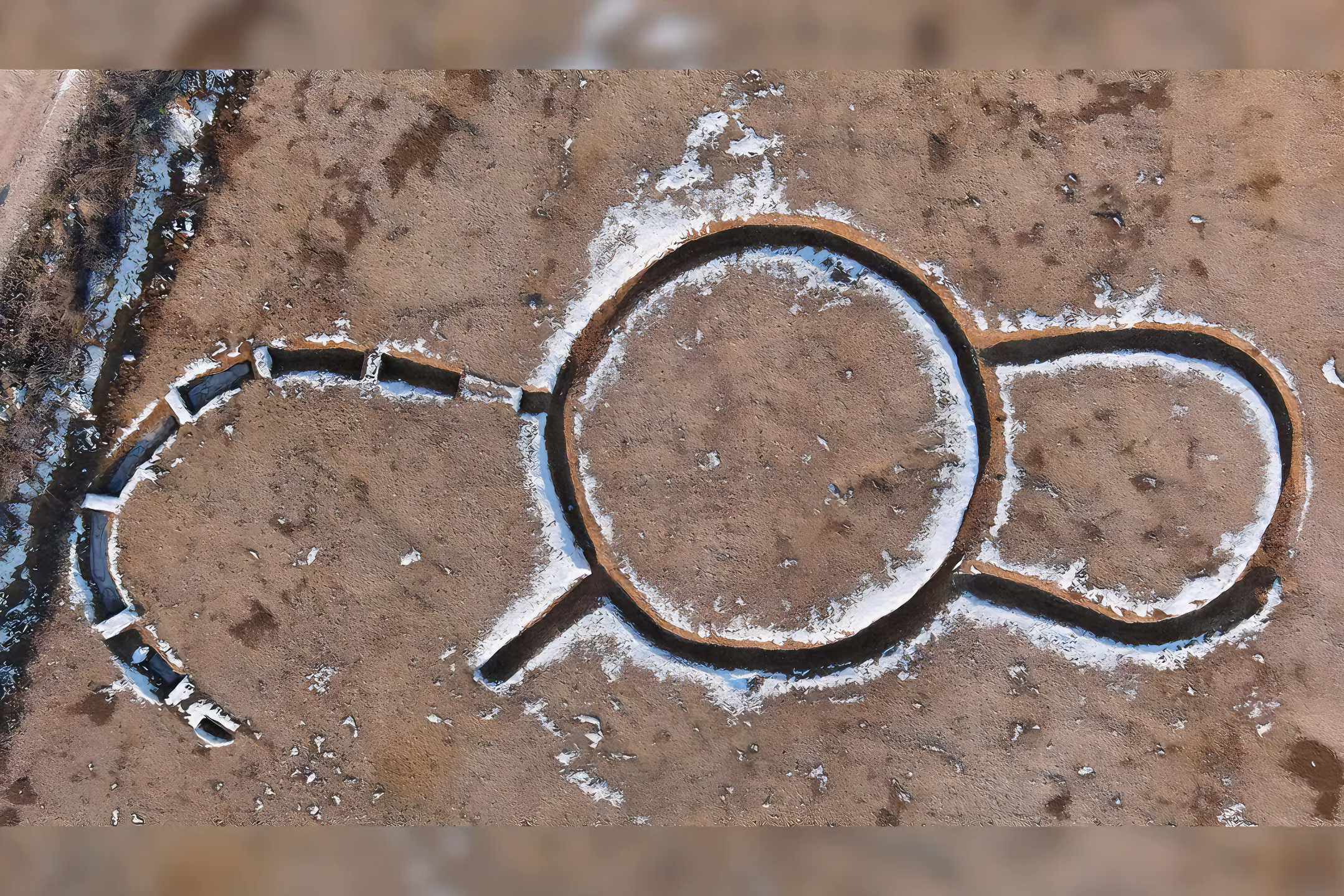 이에서 가장 흥미로운 대목은 세 개 구획으로 연결된 신석기 시대 유적이. 중앙에는 너비 11미터 거대한 원형 구조물이 있고, 그 양옆으로 두 개 작은 원형 구조물이 붙어 있다.