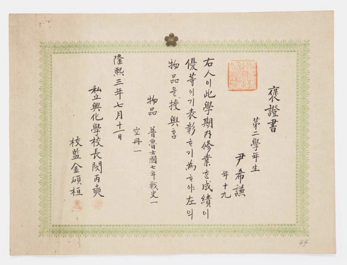 그리고 흥화학교 포증서, 진급증서, 졸업증서는 윤희겸이라는 인물이 각각 1909년, 1910년, 1911년에 받은 증서로 포증서는 성적이 우수하여 받은 증서로, 함께 독일의 프리드리히 대왕을 소개한 <보로사국7년전사(普魯士國七年戰史>책을 받은 것을 알 수 있다.