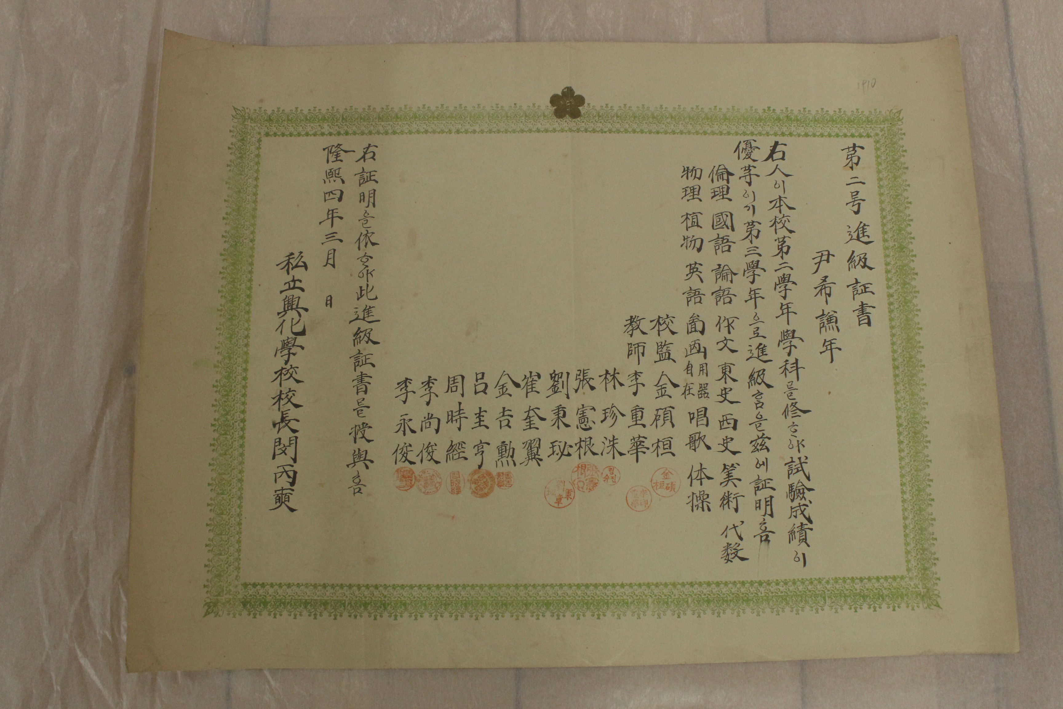 이와 함께 흥화학교 재학생인 윤희겸의 포증서(褒證書·포상증서), 진급증서, 졸업증서는 교원 변동과 교과과정의 차이, 연호표기 차이점 등 경술국치 후 역사의 변동상황이 담겨있다.