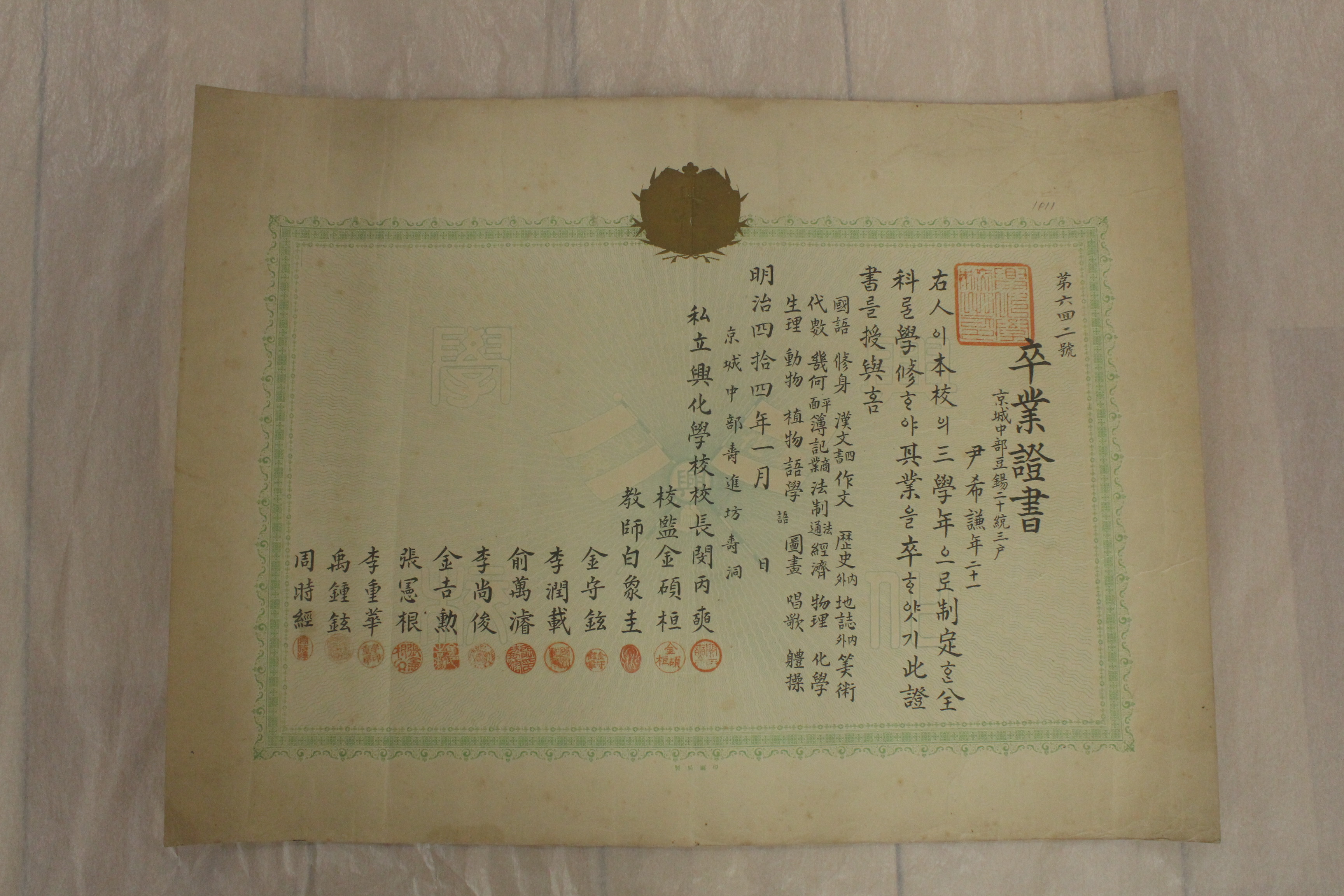 이 증서를 통해 1년 사이에 융희(隆熙) 연호에서 메이지(明治) 연호로 바뀐 점과, 황실을 상징하는 오얏꽃 무늬가 들어간 증서에서 흥화학교의 표식으로 증서가 바뀐 점을 비교해서 볼 수 있는데, 이는 1910년 경술국치 이후 흥화학교의 운영 상황 변화를 보여준다는 점에서 학술자료로서 가치가 있다.