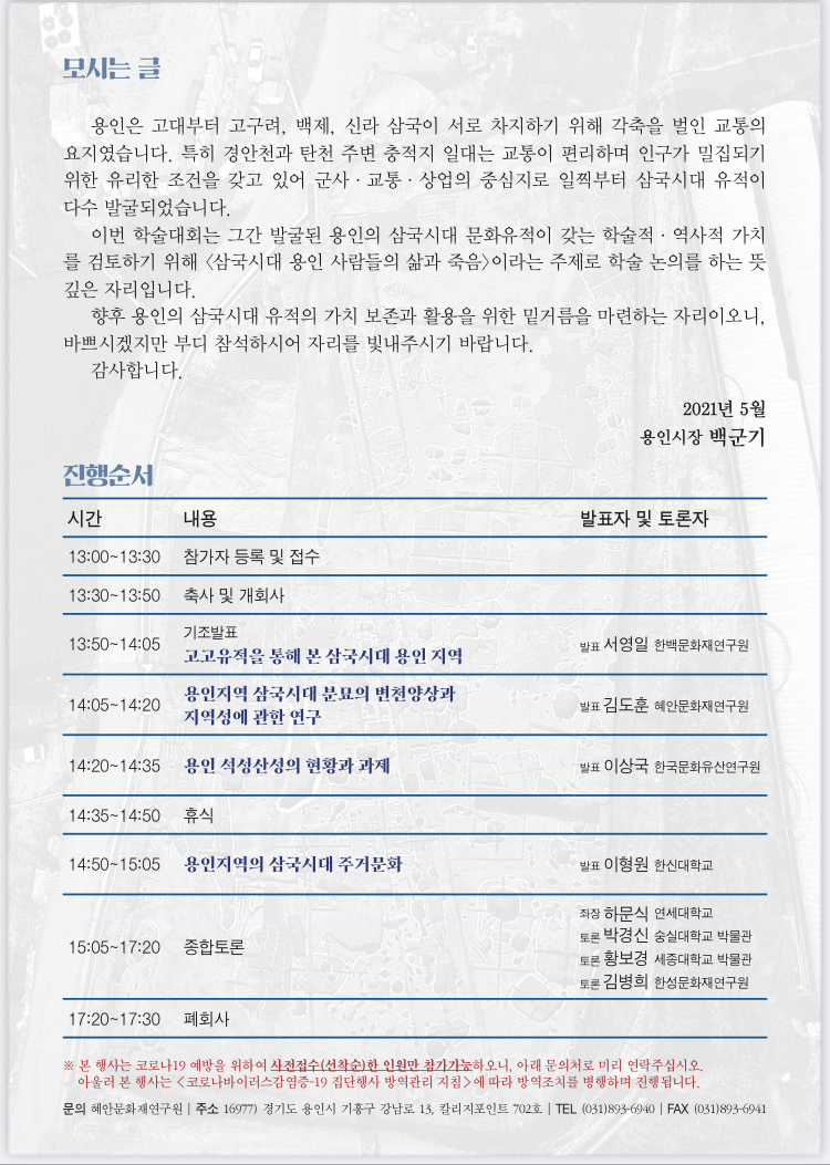 향후 용인의 삼국시대 유적의 가치 보존과 활용을 위한 밑거름을 마련하는 자리이오니, 바쁘시겠지만 부디 참석하시어 자리를 빛내주시기 바랍니다.