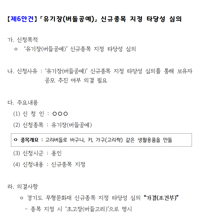 (신청 시 ‘유기장(柳器匠)’ 종목으로 신청하였는데, 심의 결과 ‘초고장(버들고리)’으로 명시하라는 조건부로 가결됨)