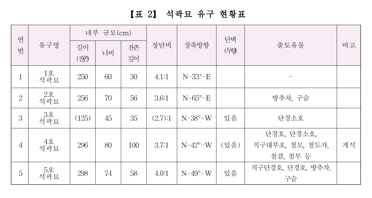 3. 석곽묘의 장축방향은 등고선과 직교한 방향으로 조성되었다. 석곽묘는 수혈식 석곽 묘로 축조방식은 두향 방면의 단벽 유무에 따라 크게 3가지로 구분할 수 있다. 두향 방면 단벽을 석축하지 않고 굴착면을 그대로 이용한 석곽묘 2기, 두향 방면 단벽을 석축으로 조성한 석곽묘 1기, 두향 방면 단벽을 굴착면과 석축을 모두 이용하여 조성한 것 2기이다.