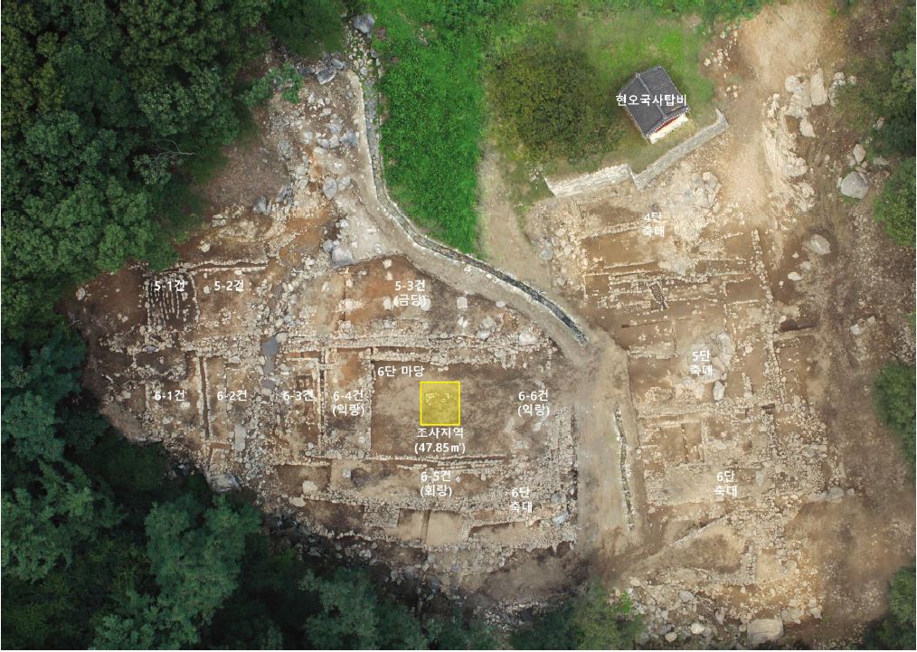 시는 이 자리에서 현오국사탑비를 세우기 위해 장방형으로 석축을 쌓아 올린 흔적을 발견했으며, 이 석축의 크기가 현오국사탑비의 아랫부분에 있는 받침석 크기와 유사한 것을 확인했다.
