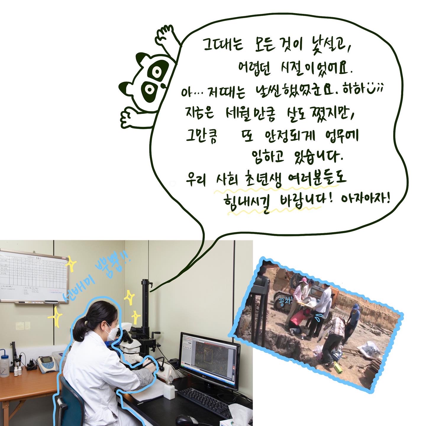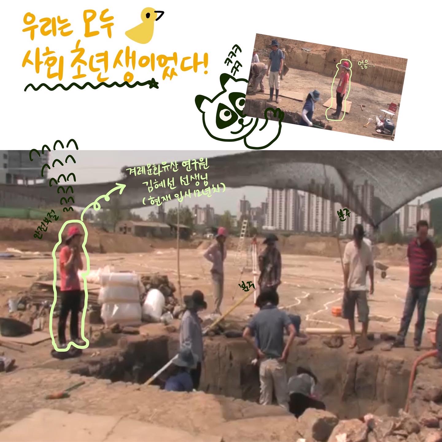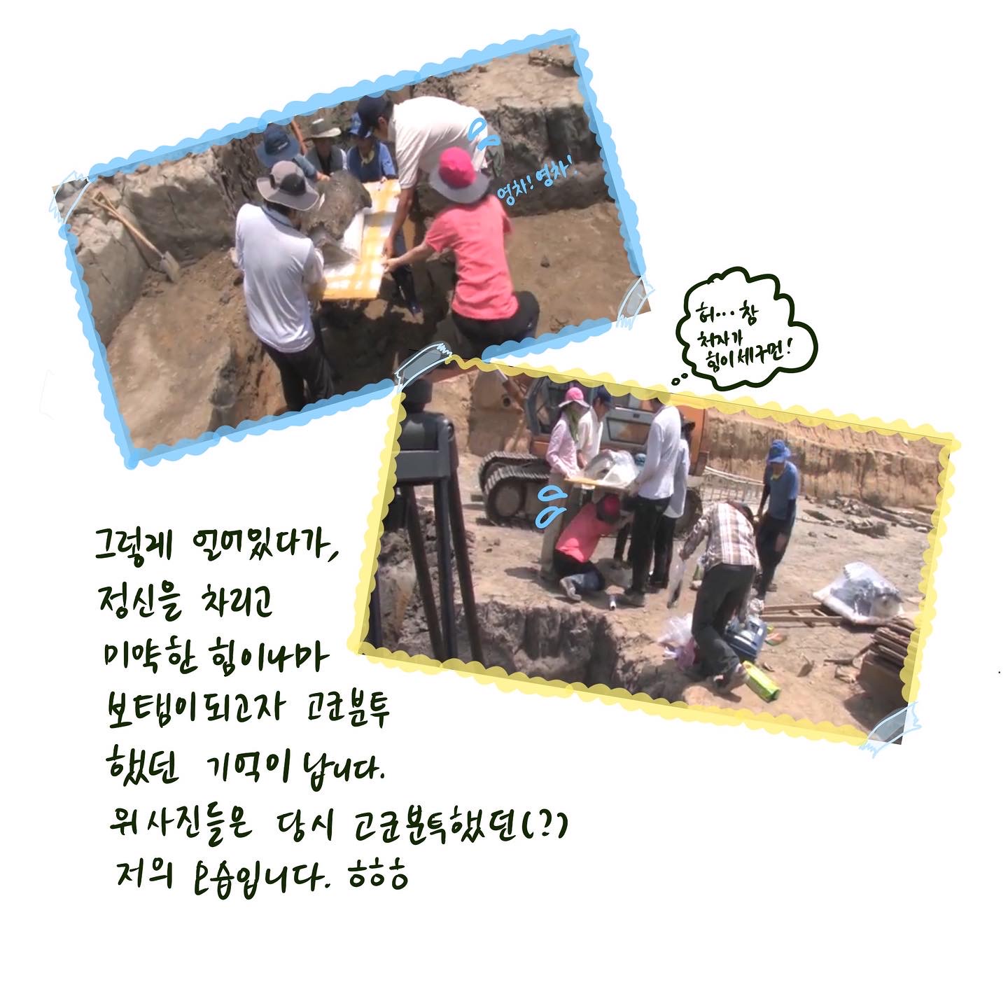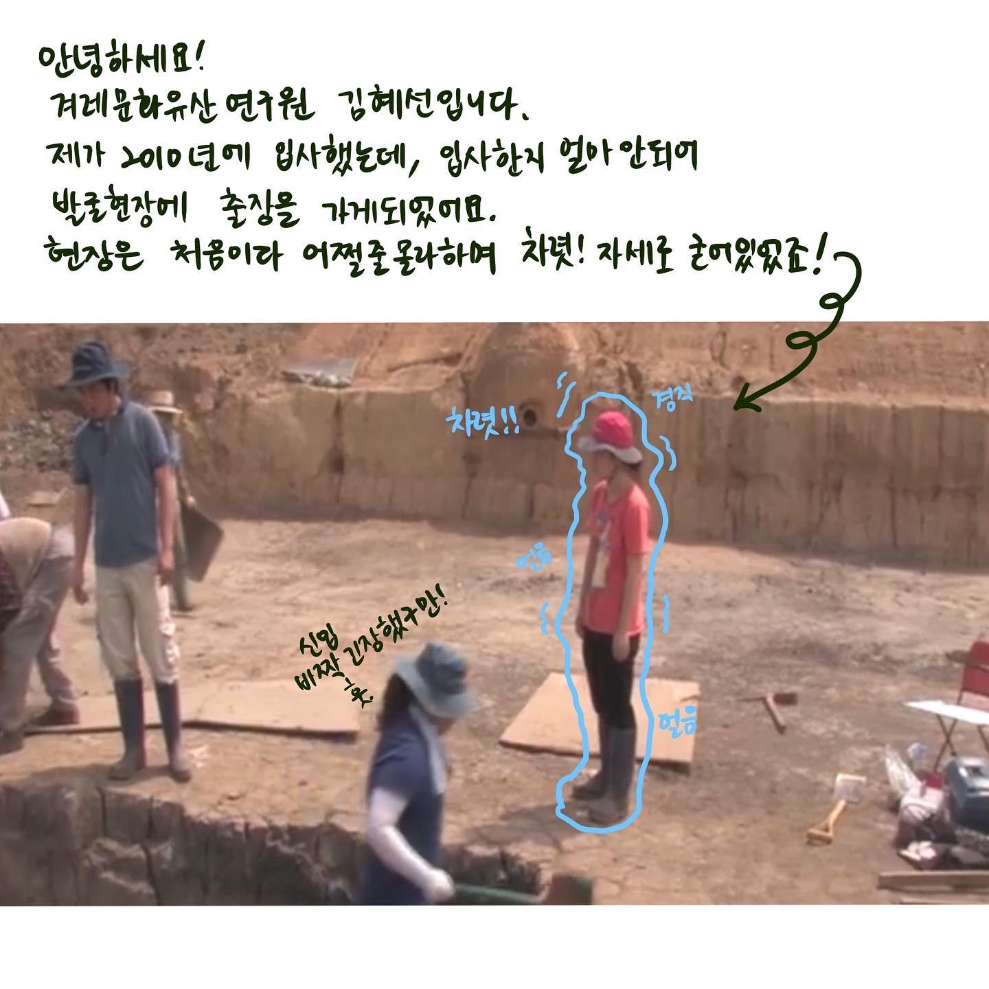 발굴현장에 간 게 처음이라, 어쩔 줄 몰라하며 차렷자세로 굳어 있었죠! 그러다 정신을 차리고 저의 미약한 힘이나마 보태고자 고군분투 하고 있던 모습입니다! 💪