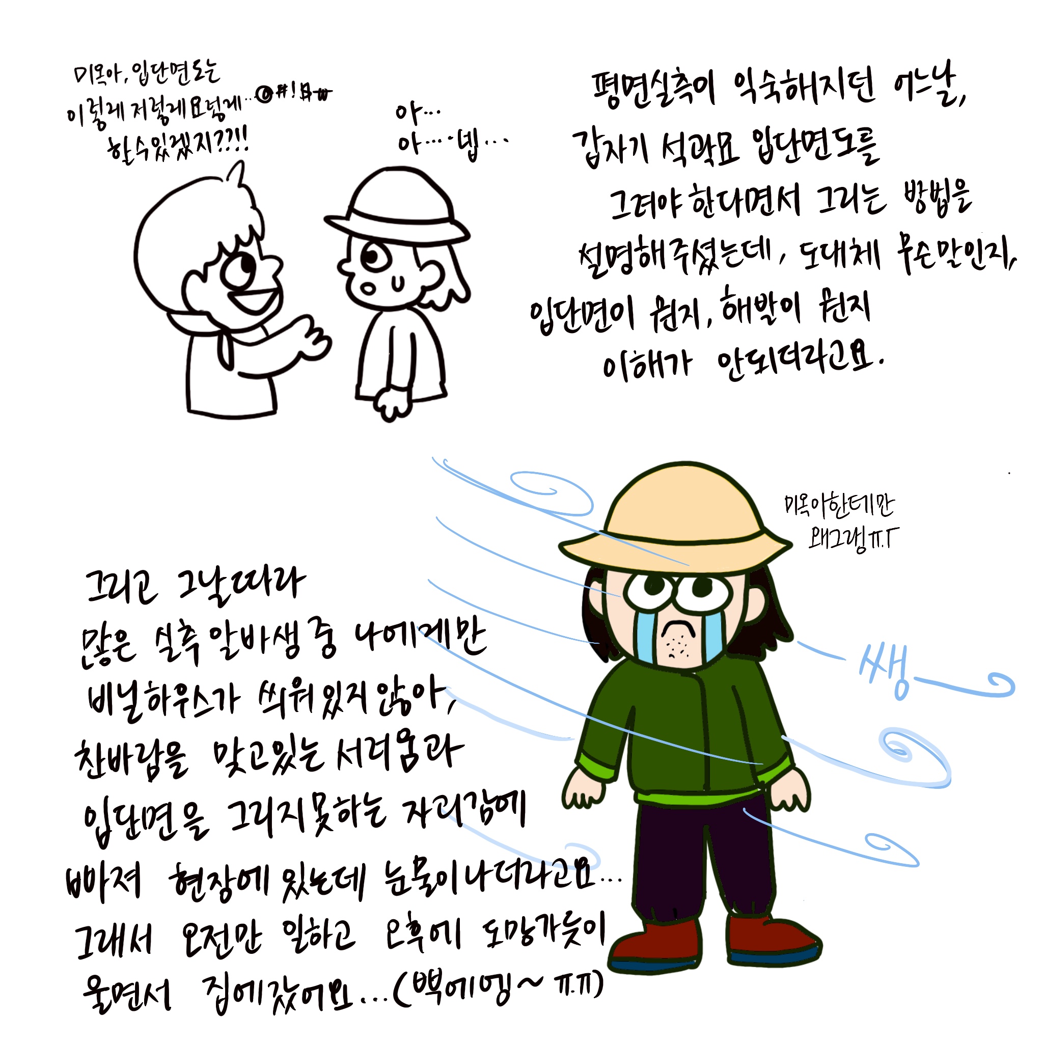 그날따라 많은 실측 알바생중 나에게만 비닐하우스가 씌워지지 않아, 찬바람을 맞고 있는 서러움과, 입단면을 그리지 못하는 자괴감에 빠져 현장에 있는데 눈물이 나더군요. 그래서 오전만 일하고 오후에 도망가듯이 울면서 집에 갔어요.