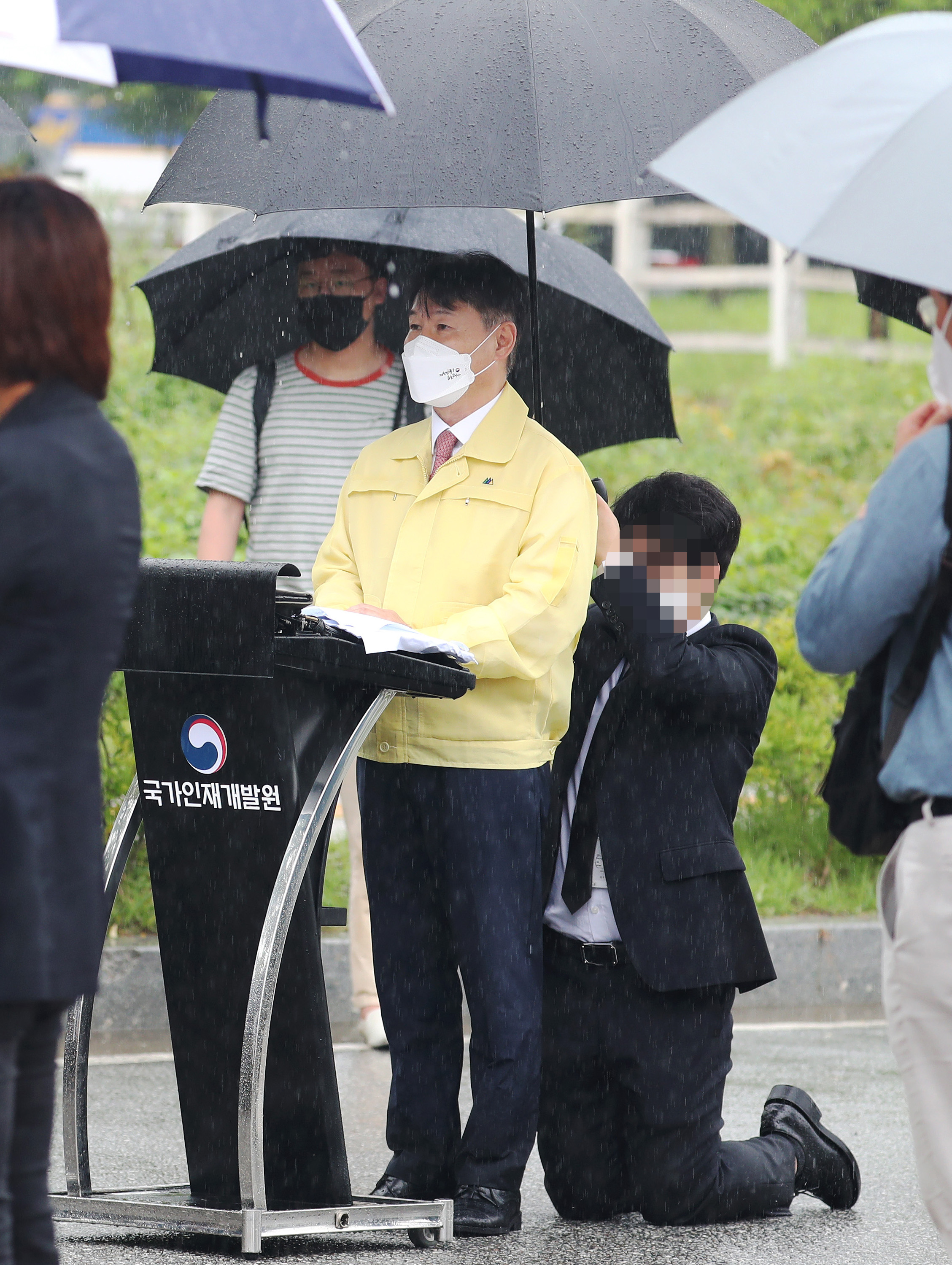 (진천=연합뉴스) 김주형 기자 = 강성국 법무부 차관이 27일 오전 충북 진천 국가공무원인재개발원에서 아프가니스탄 특별입국자 초기 정착 지원과 관련해 브리핑하는 도중 관계자가 뒤쪽에서 무릎을 꿇고 우산을 받쳐주고 있다. 2021.8.27