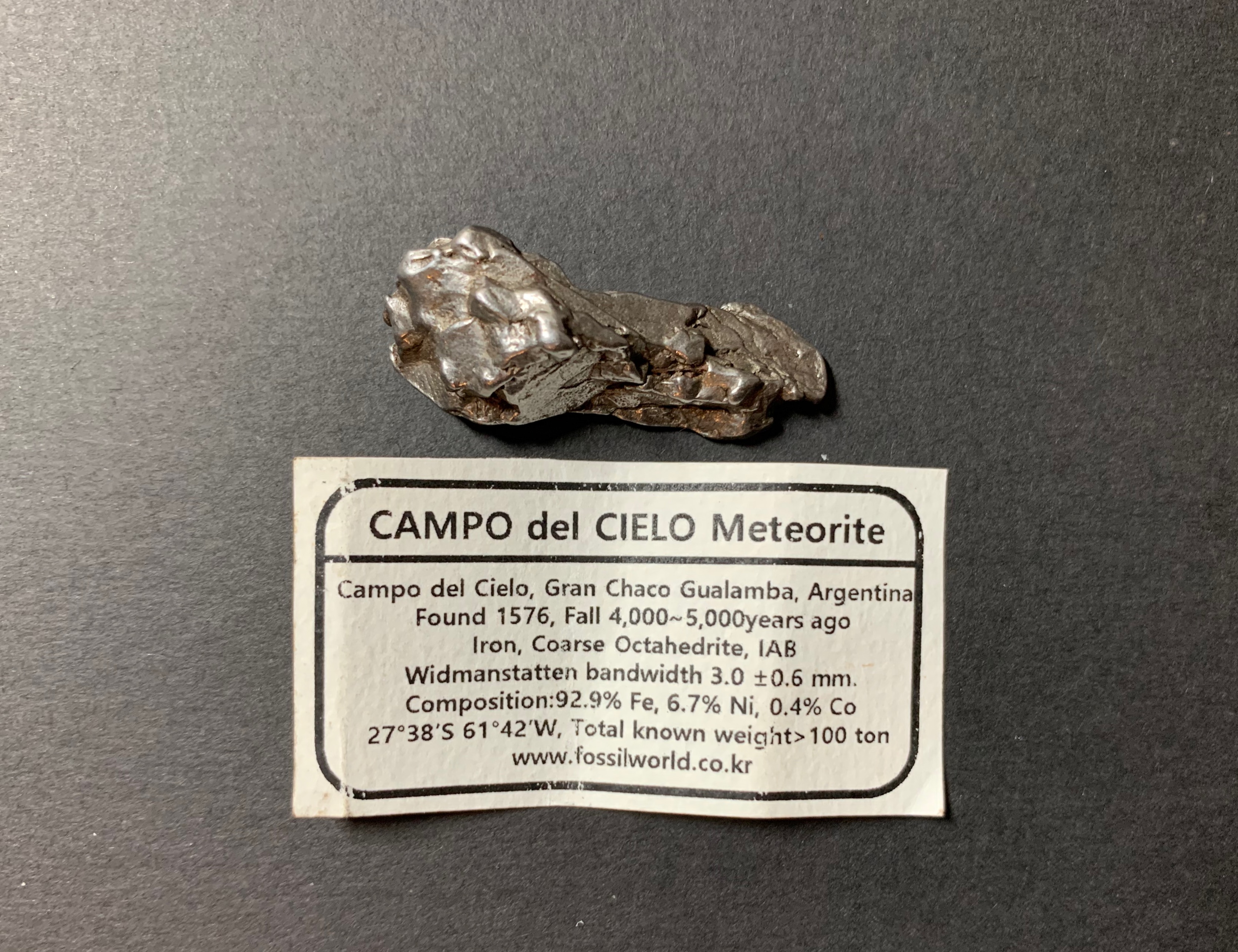 제가 선물 받은 운석은 Campo del Cielo Meteorite(캄포델시엘로 운석) 입니다.