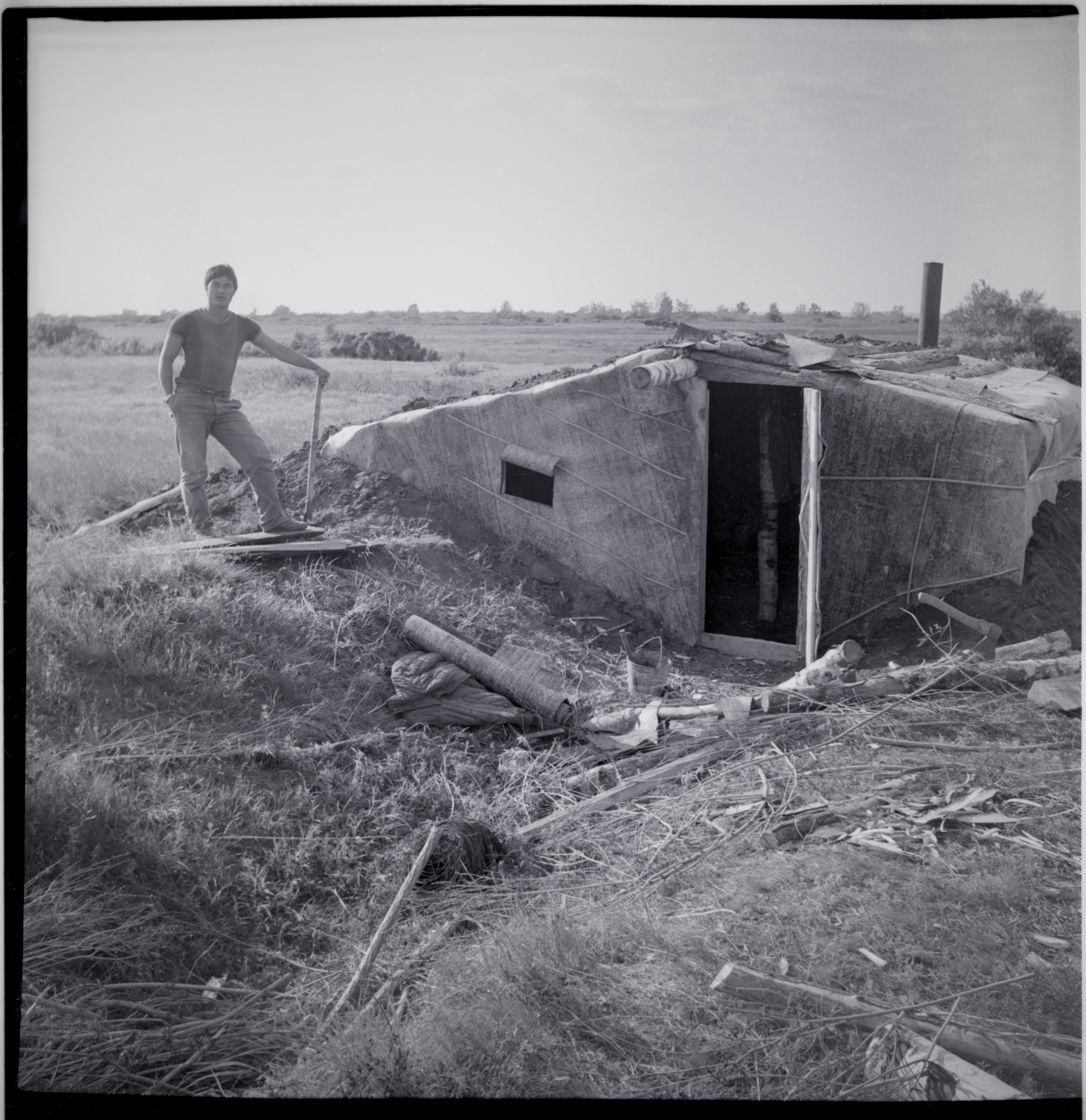 &lsquo;땅집&rsquo; 옆에 선 안 비탈리 1981 러시아 오렌부르크 주 악불락 마을 Akbulak, Orenburg Oblast, Russia 원정농업을 하는 사람들이 임시로 거처하는 집이다. 원정농업을 하는 가구는 파종하는 3월에 집을 떠나 임대한 농지 근처에 만든 &lsquo;땅집&rsquo;에서 머물고, 수확을 하고 난 10월에 원래의 주거지로 돌아온다.