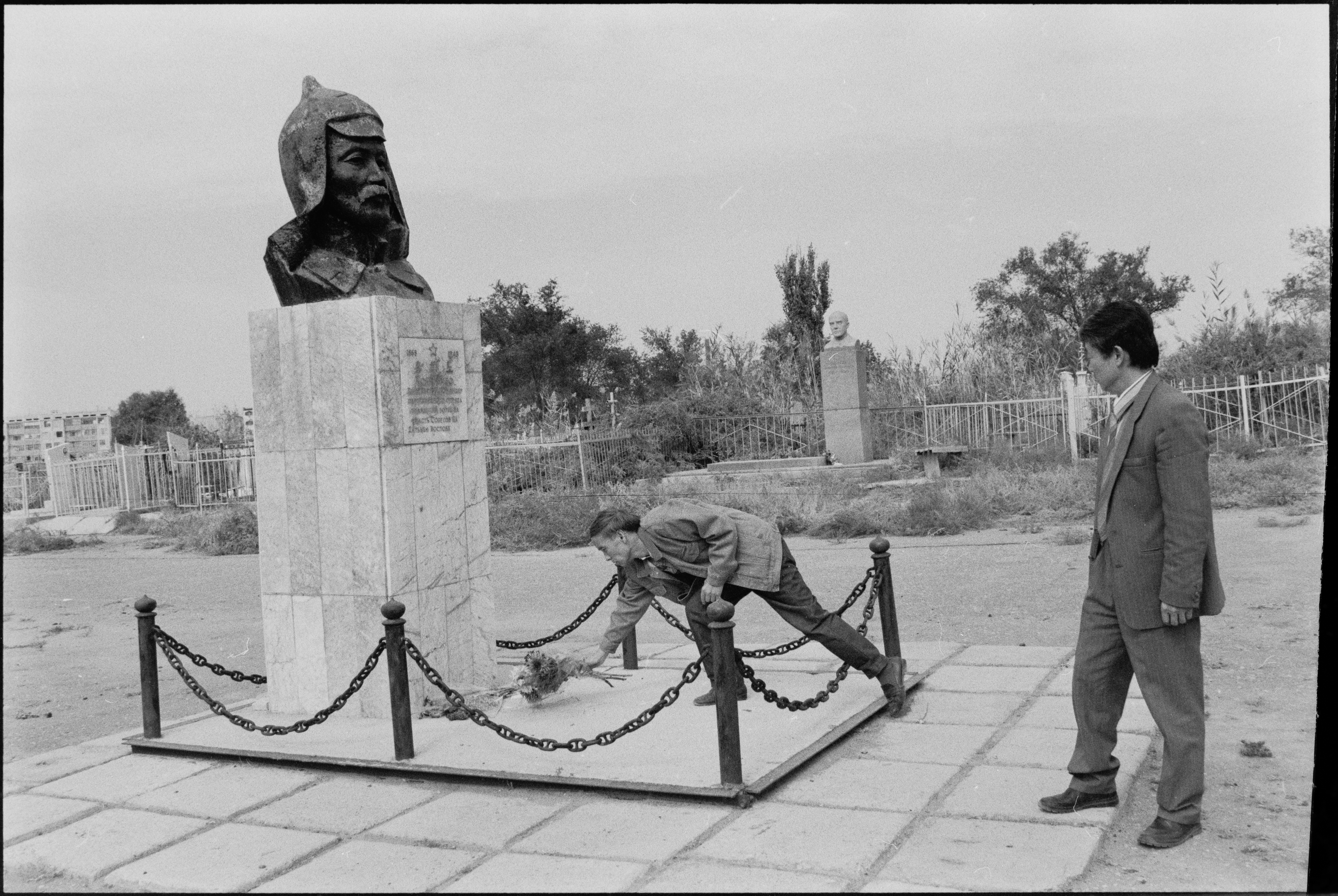 홍범도의 흉상에 꽃을 바치는 고려인 1995 카자흐스탄 키질로르다 시 Kyzylorda, Kazakhstan 홍범도(Хон Бумдо: 1869-1943)는 일제강점기의 대한독립군 총사령관이자 대한독립군단 부총재 등을 역임한 독립운동가로, 연해주에 머물며 활동하다 1937년 현재의 카자흐스탄 키질로르다로 강제 이주되었다. 그는 고려인의 자랑이자 존경받는 영웅이다. 한국인에게도 홍범도는 일제강점기 독립운동의 영웅으로 기억되고 있다. 한국 정부는 이미 1962년 홍범도에게 건국훈장 대통령장을 추서한 바 있고, 2021년에는 홍범도의 유해를 옮겨 와 대전현충원에 안장하며 건국훈장 대한민국장을 재차 추서했다.
