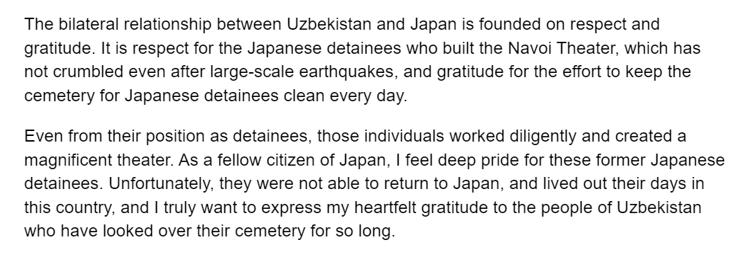 (의역) 우즈베키스탄과 일본의 양국 관계는 존중과 감사를 바탕으로 하고 있습니다. 대규모 지진에도 무너지지 않은 나보이극장을 건설한 일본군 수용자들에 대한 존경심과 매일매일 일본군 수용자들의 묘지를 깨끗하게 유지하기 위한 노력에 대해 감사드립니다.
