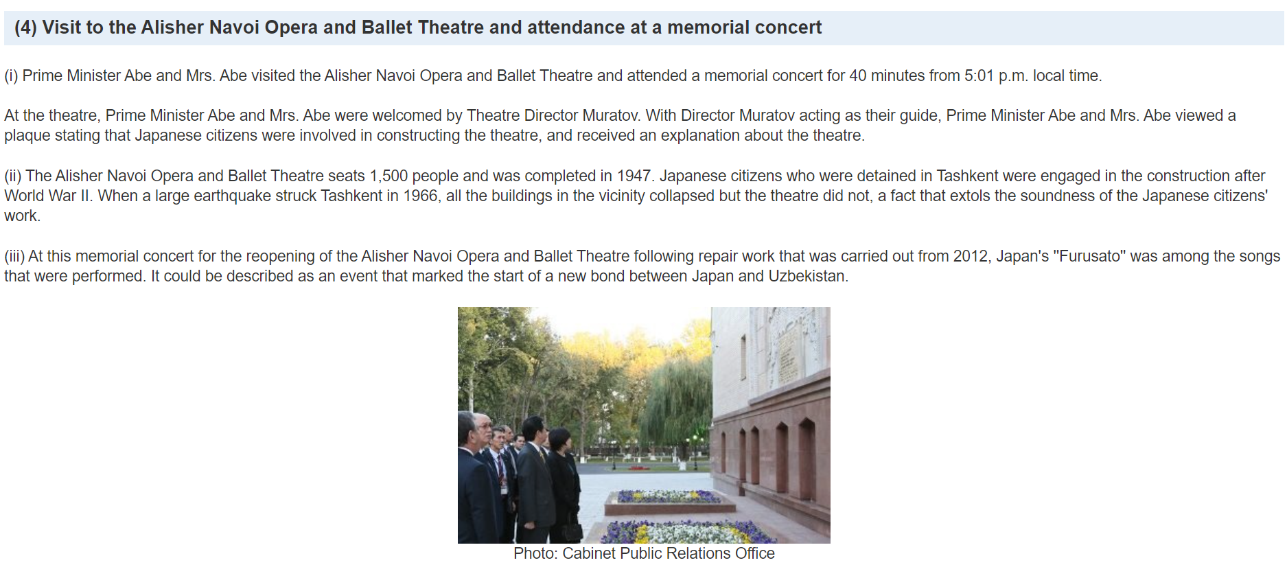 i) 아베 총리 내외는 현지시각 (*작성자 주 : 2015년 10월 26일) 오후 5시 1분부터 40분간 알리셰르 나보이 오페라·발레극장을 방문해 추모 콘서트에 참석했다.