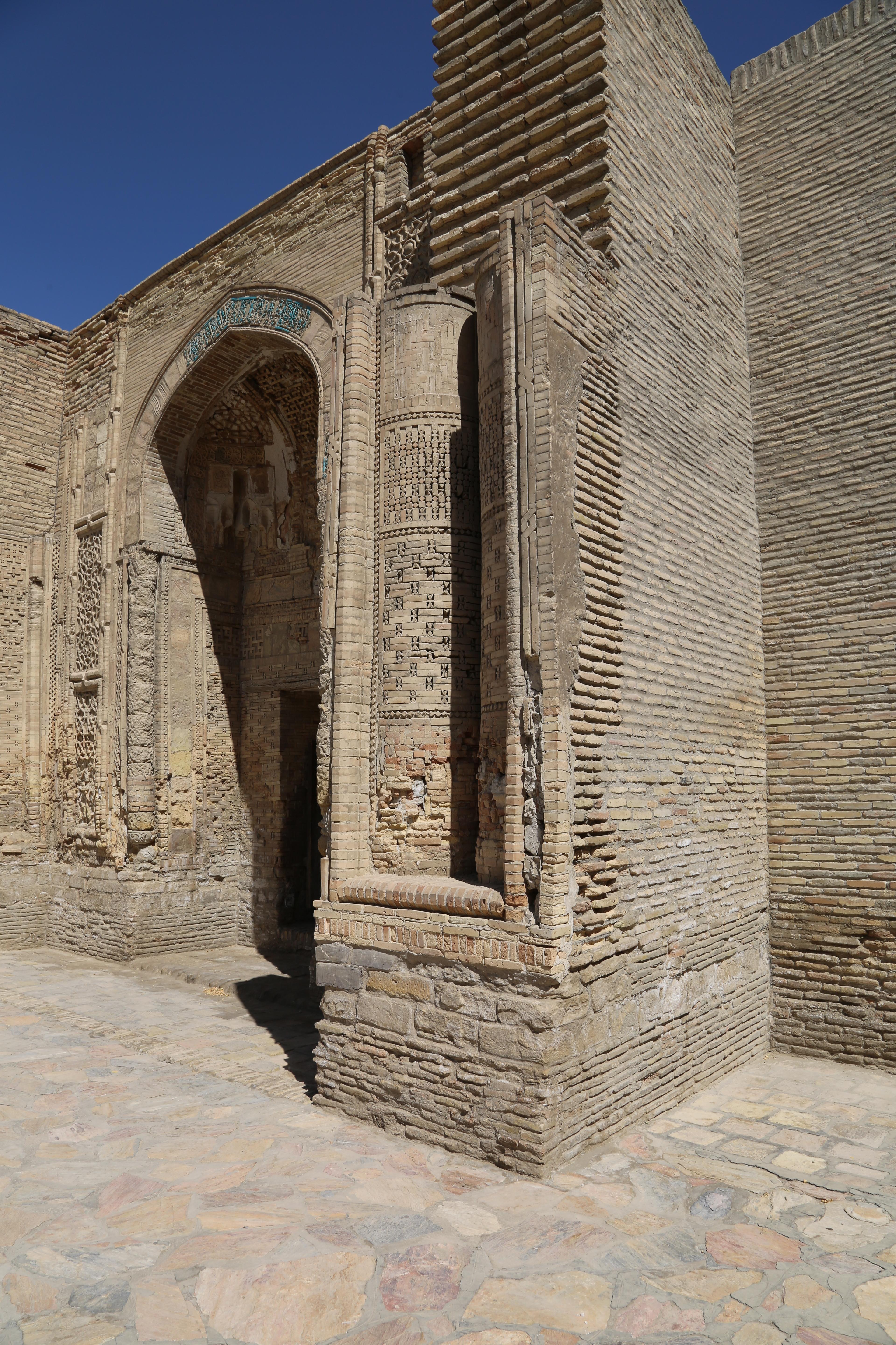 아래에 조각된 조르아스터교 아라베스크 무늬의 벽돌층, 그 위 불교양식 기단 그리고 그 위에 이슬람 건축양식을 보여준다.