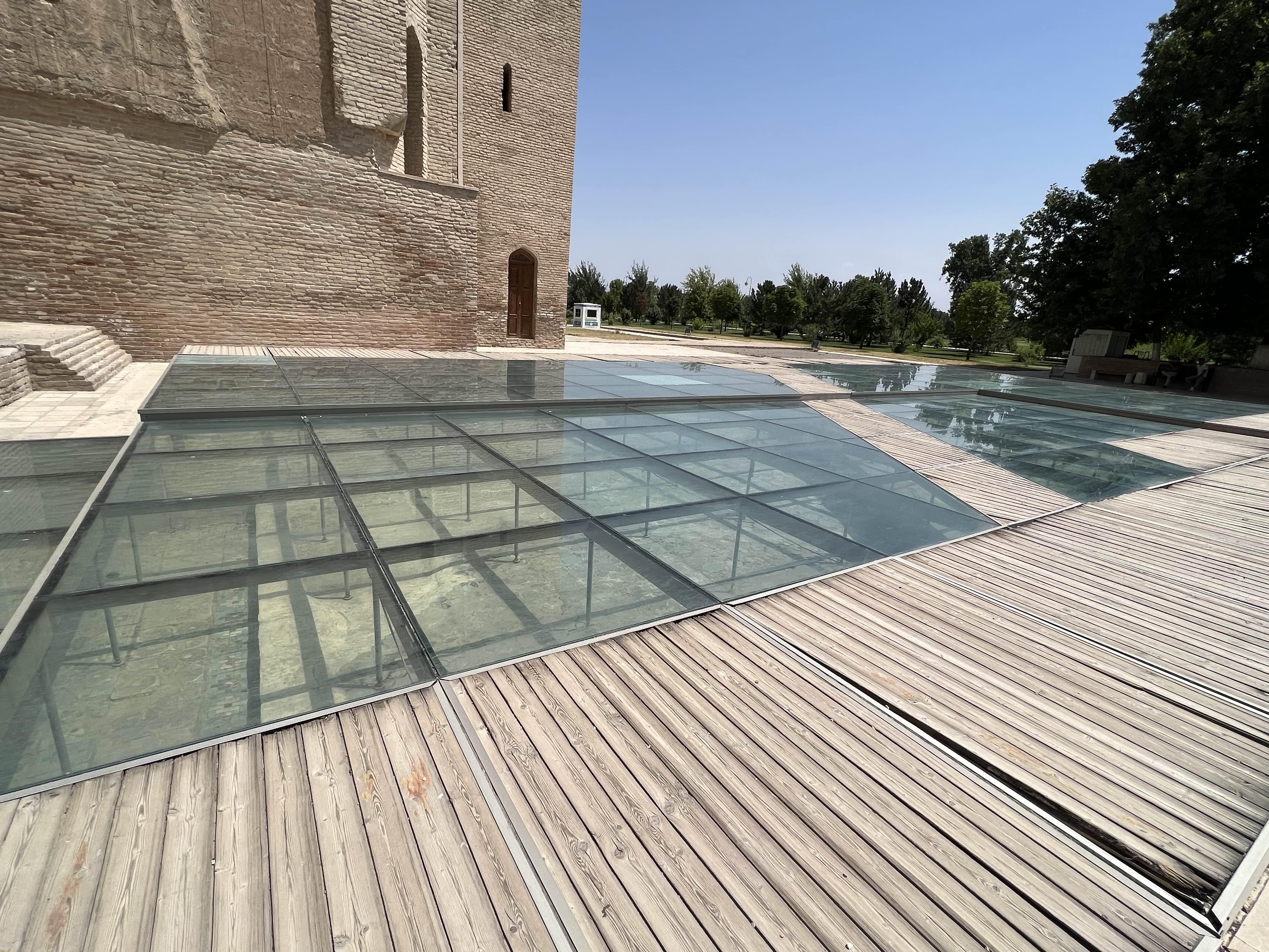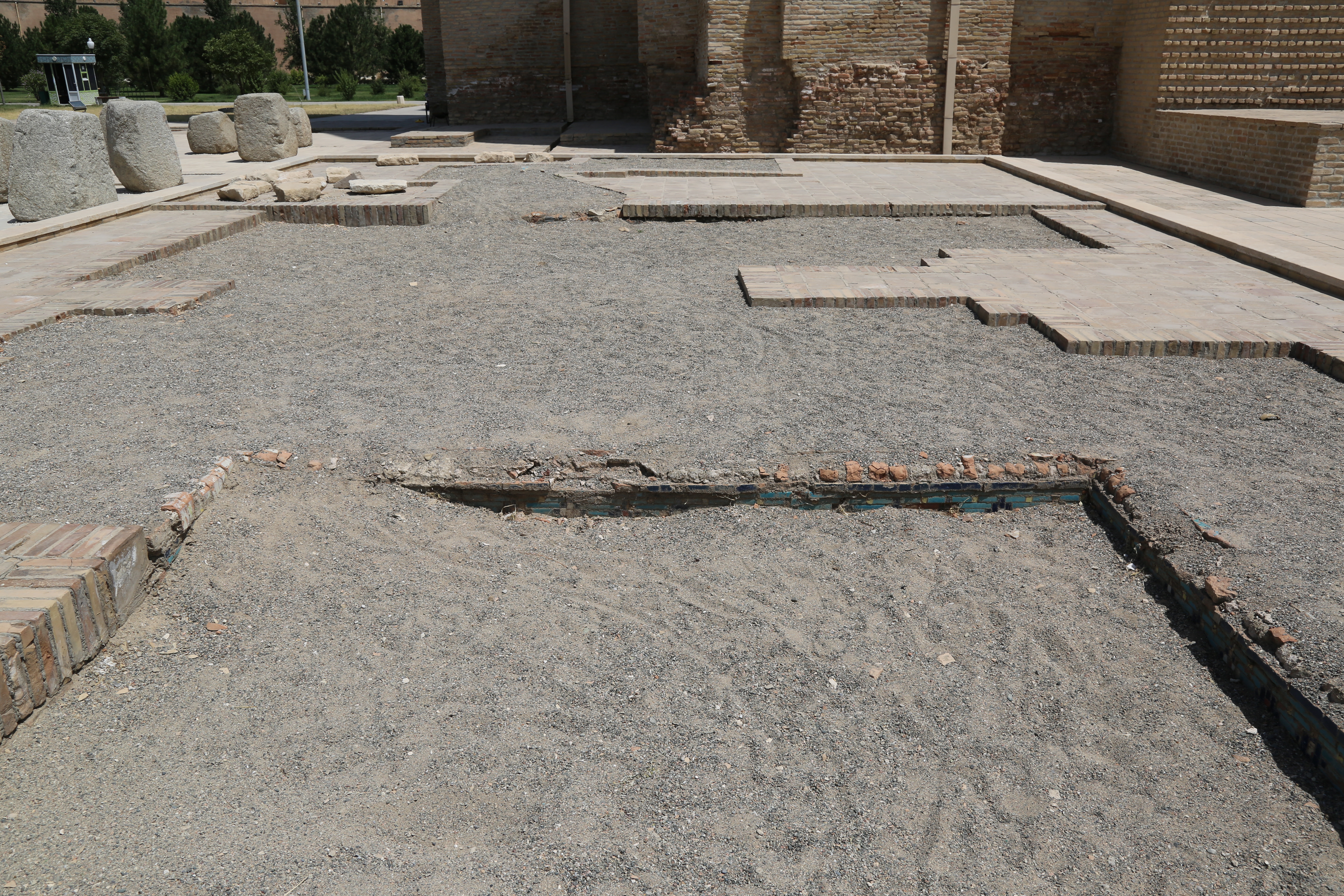 히바와 부하라를 거치면서 많은 모스크 건축물을 보았기에, 여행 5일 차가 되니 이제 모스크 건축물이 거기서 거기 같다는 느낌이 들기 시작했건만, 이 거대한 악 사라이 궁전을 보니 새삼 제국의 힘이 느껴졌다. 문 뒤쪽에는 궁전터로 추정되는 유구 일부가 남아 있었다.