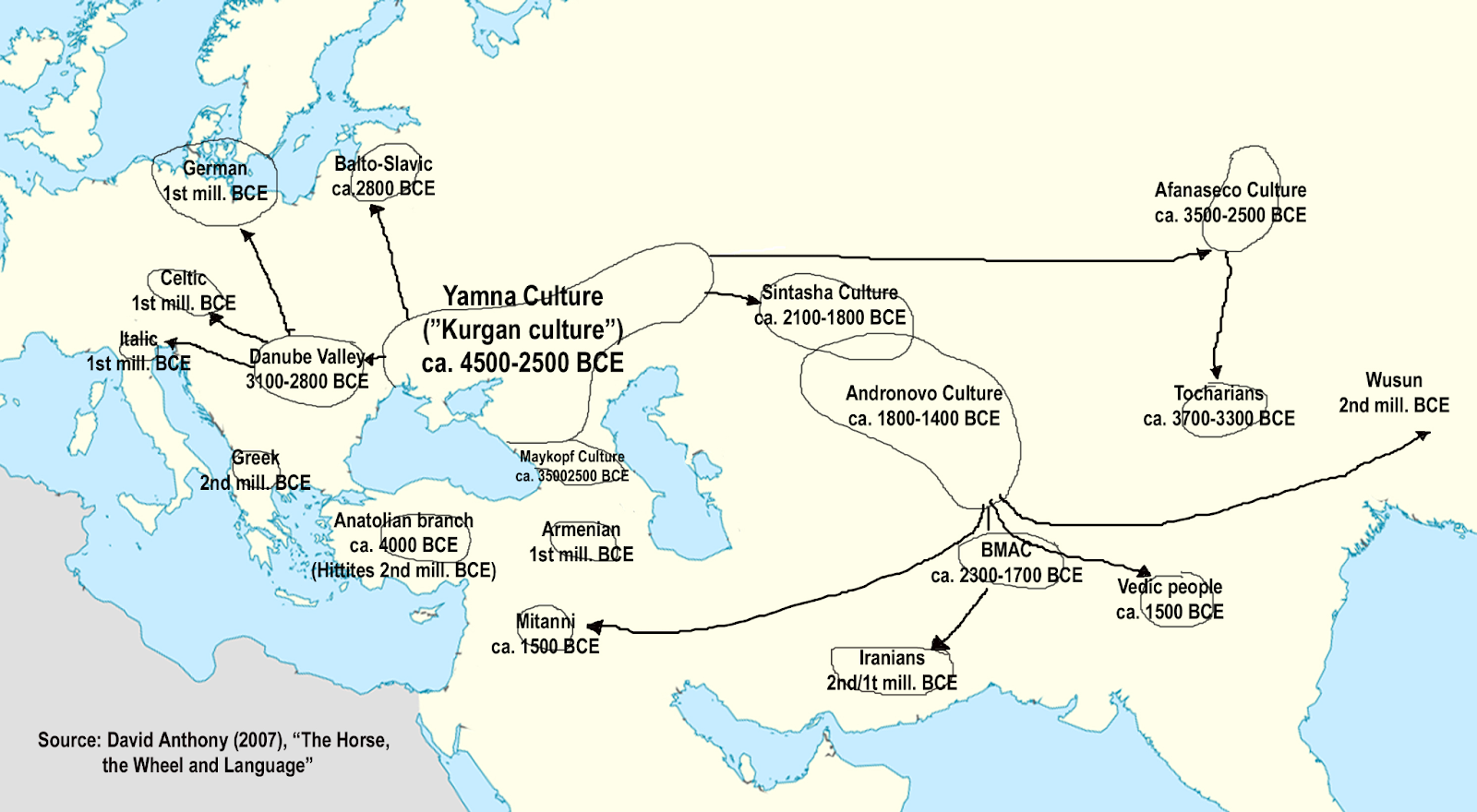 우크라이나 동부 지역에서 발원한 인도유럽 어족의 말과 문화가 이란으로, 인도로 퍼져나갔고 일부는 유럽으로 들어가 그곳에 정착했다. 그리고 아주 적은 수의 사람들은 동쪽으로 진출하여 타림분지로도 진입했다는 것이 통설이다.