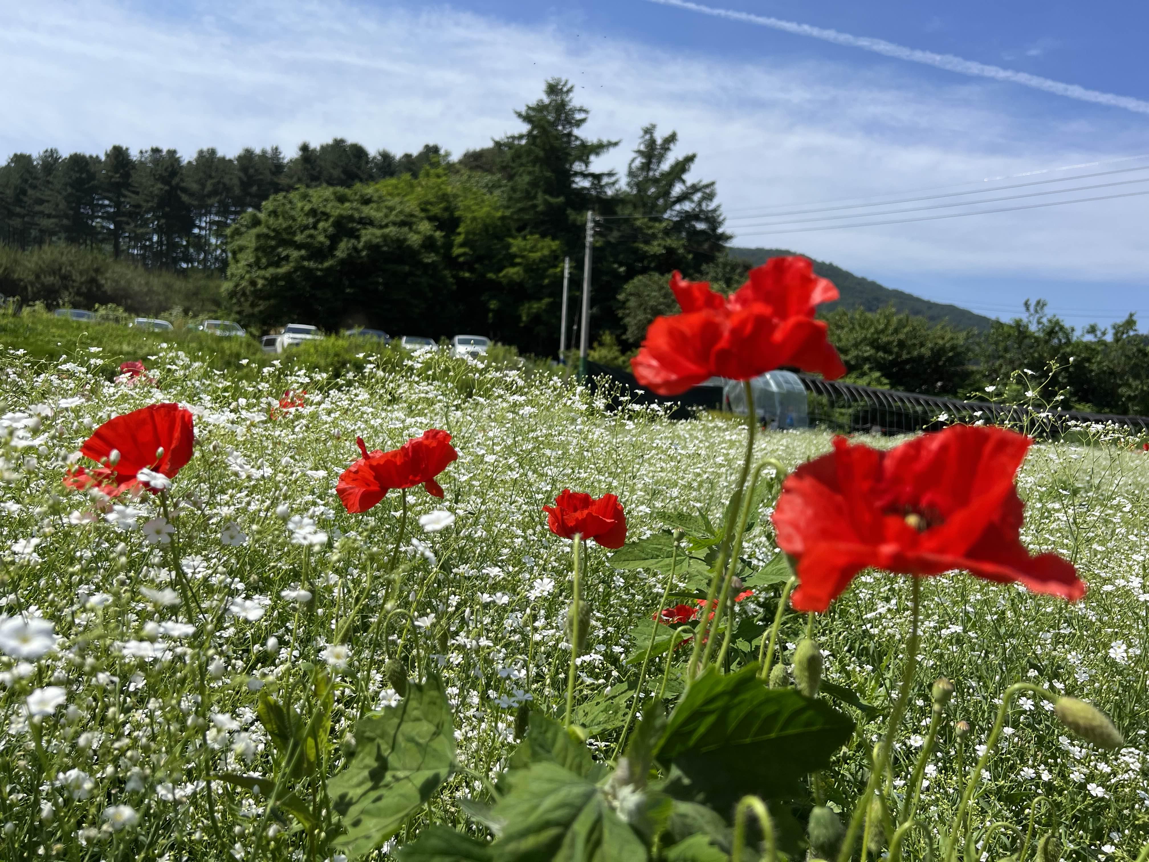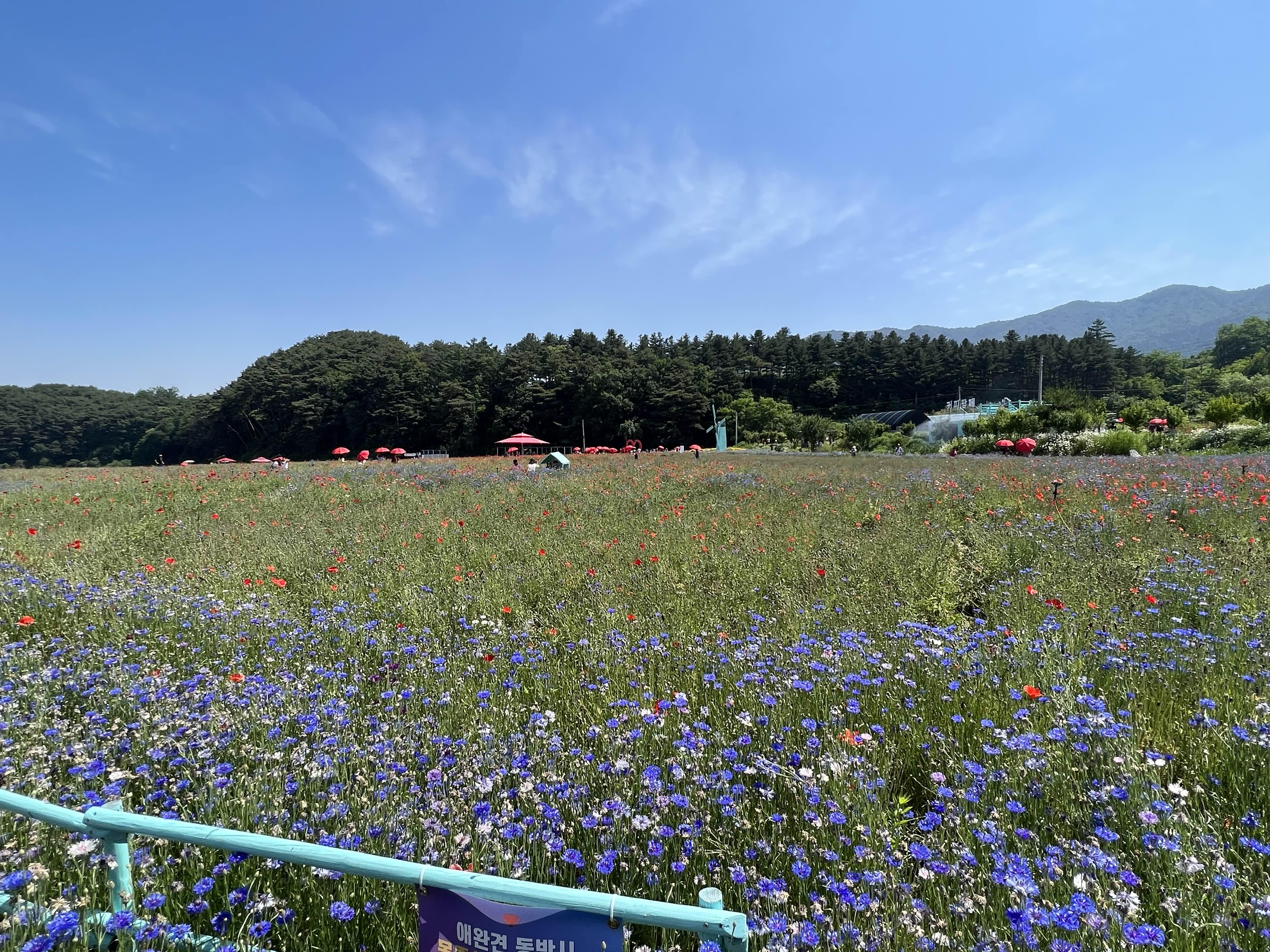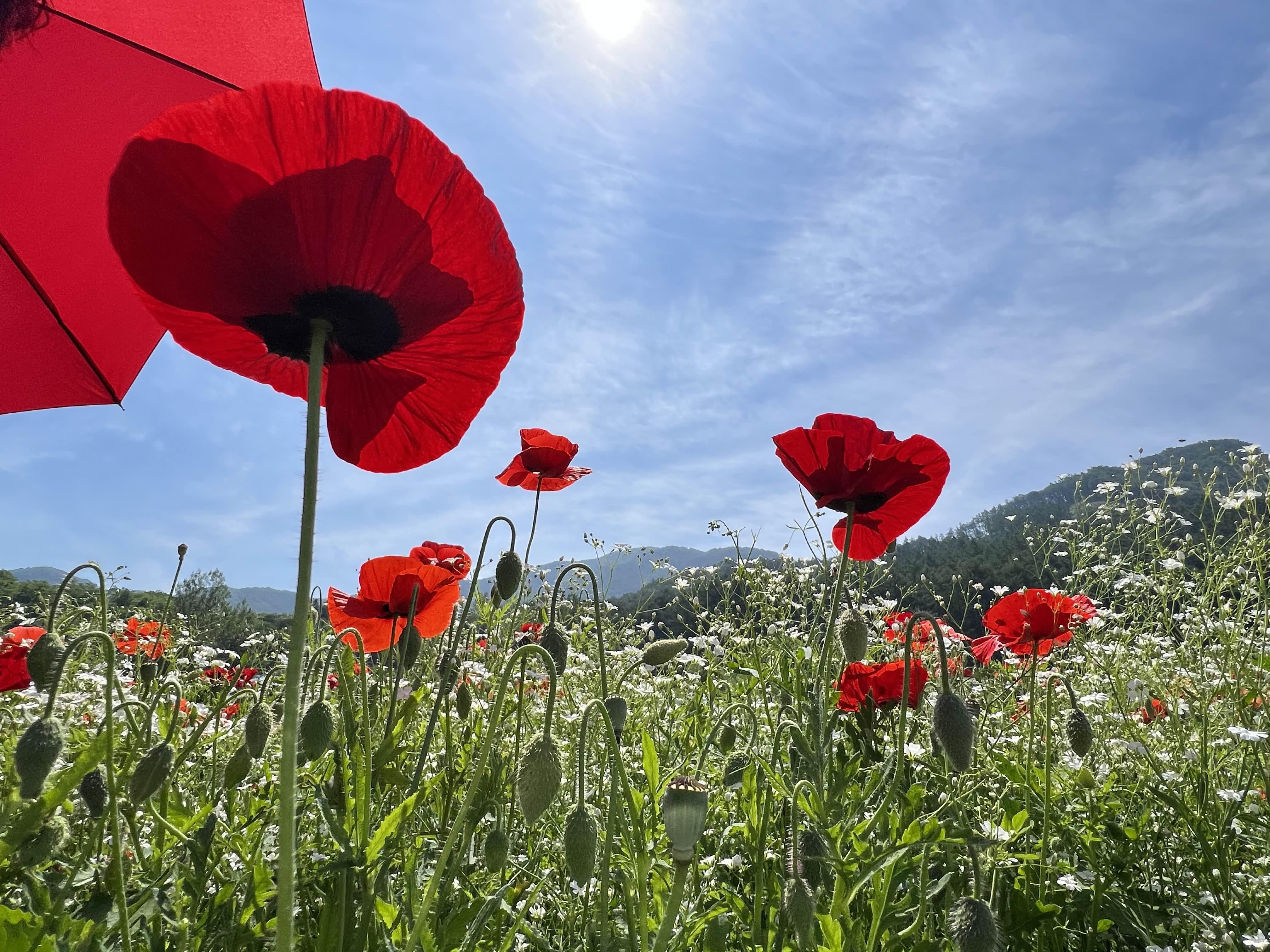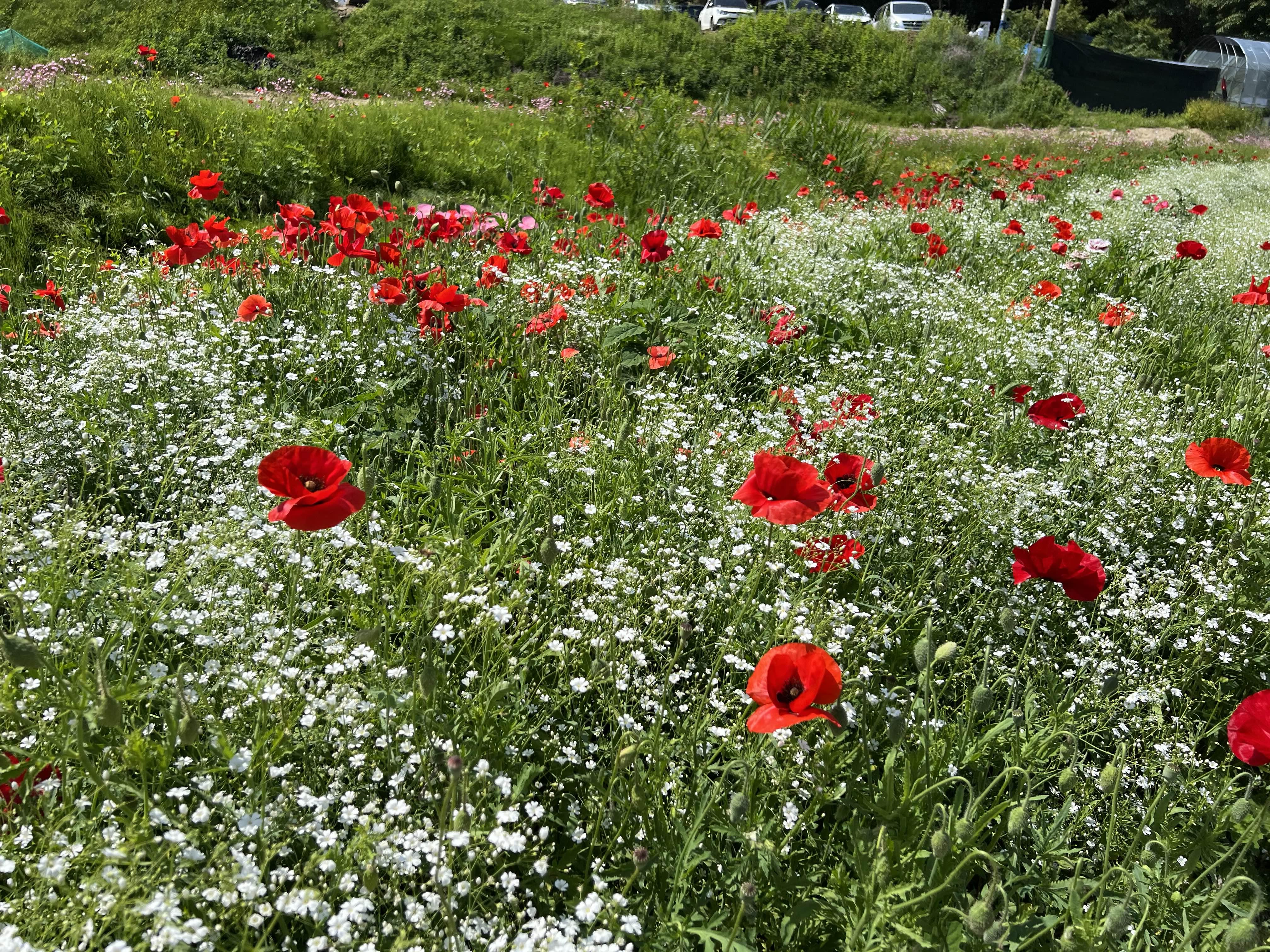축제 마감 이틀 전이라, 꽃이 많이 저물었지만, 그래도 강렬한 붉은 색상의 양귀비꽃과 보라색 수레국화,