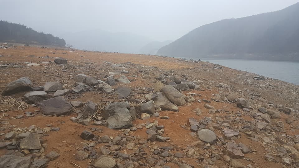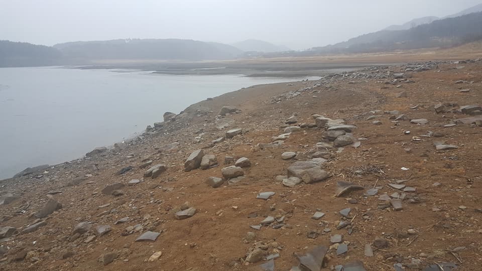 한데 갈수기라 평소에는 수몰한 상태인 호수변이 바닥을 버쩍 드러냈는데, 고선사지로 좀 더 가까이 가보고자 하는 마음에 그쪽으로 다가갔더니 웬걸? 그 바닥이 온통 무덤이었고, 그 무덤이 수몰해서 노출한 무수한 토기 파편이 나뒹구는 것이 아닌가? 살피니 주변이 온통 무덤이었다. 딱 봐도 적석목곽분들이었고, 널부러진 토기들도 온통 적석목곽분 시대 신라토기 그것이었다.