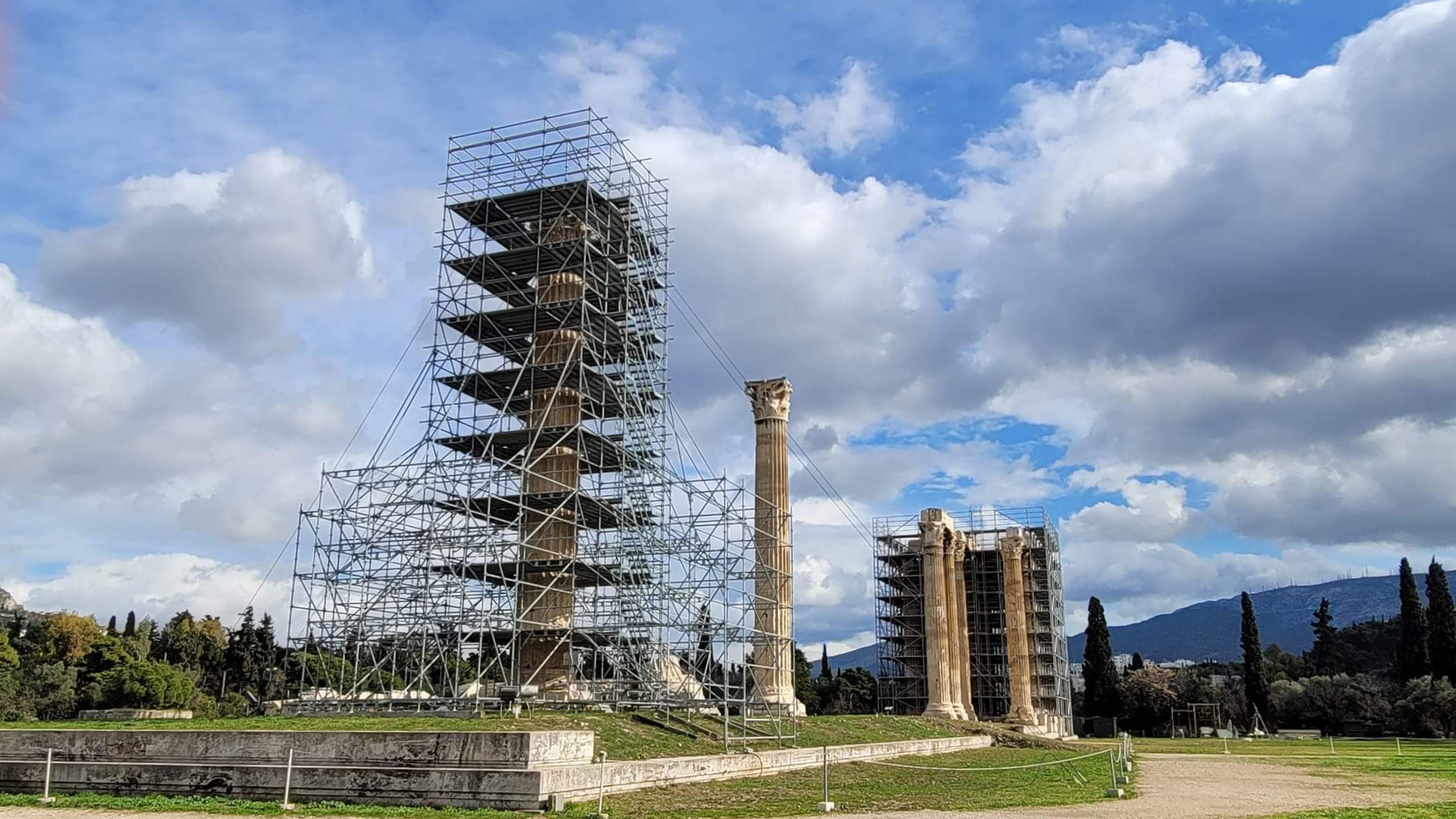 사진은 그리스 아데나이를 여행 중인 장향실 선생이 아크로폴리스 아래 제우스 신전 지금 풍광이라 담은 몇 컷 중 하나라 보니 자빠진 신전 기둥 하나를 세우는 중인 듯 아시바 잔뜩 씌워 놓은 저 구역이 그것이라