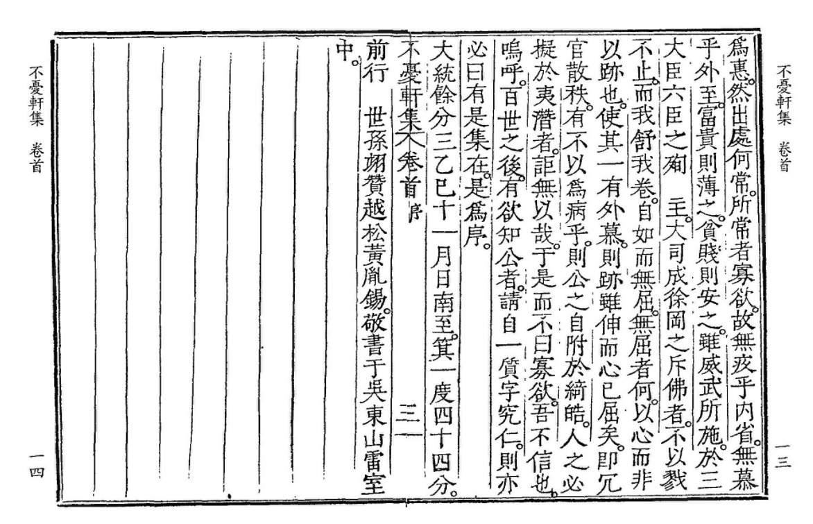 명明나라 대통력大統曆을 사용한 나머지의 세 번째 을사년(1785, 정조9) 11월 동짓날 기성箕星 1도度 44분分에 전前 행 세손익찬世孫翊贊 월송越松 황윤석黃胤錫이 경건히 오동吳東 산뢰실山雷室에서 쓰다. (ⓒ 한국고전번역원 | 김홍영 (역) | 1998)