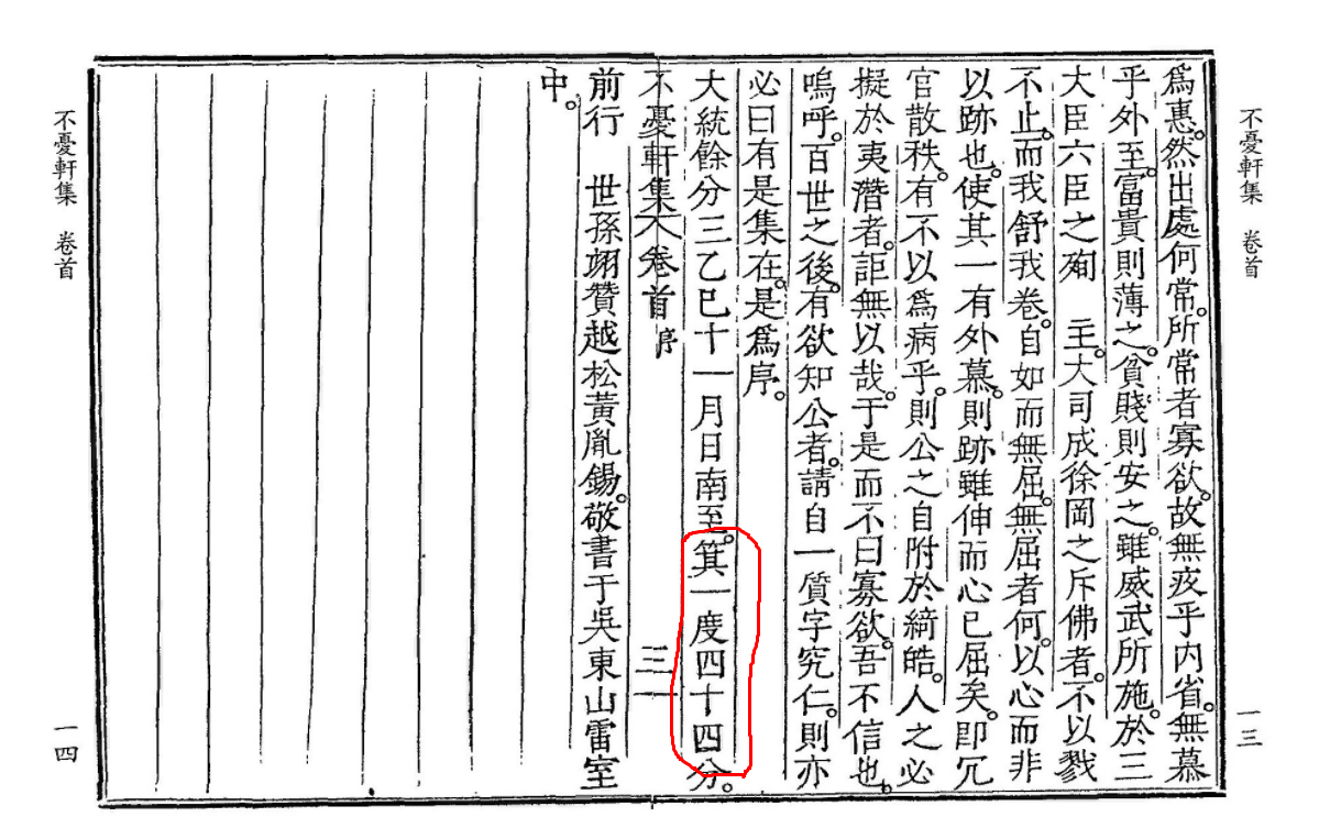 南至가 곧 冬至라, 아무튼 관건은 箕一度四十四分 이라는 대목이 되겠다 싶었으니, 대체 이건 무슨 개뼉다귀란 말인가 싶다가도 왜 하필 이재는 시간을 저리 표시했을까도 의아했으니, 아무튼 이 대목에서도 이재가 또라이 기질을 유감없이 발휘했다 하겠다. 하긴 연도를 표시한 大統餘分三이라는 표현도 이채롭기는 마찬가지다.