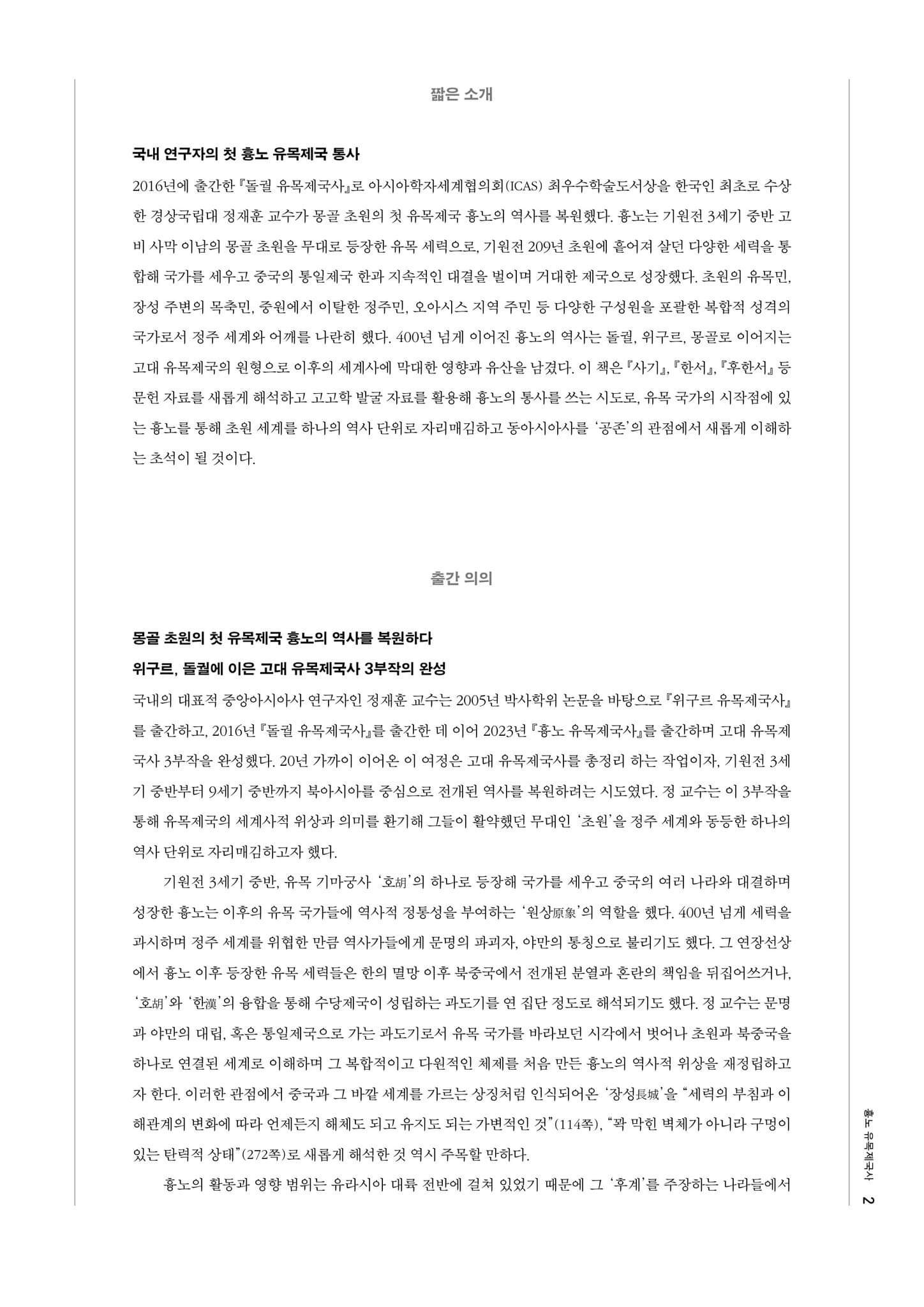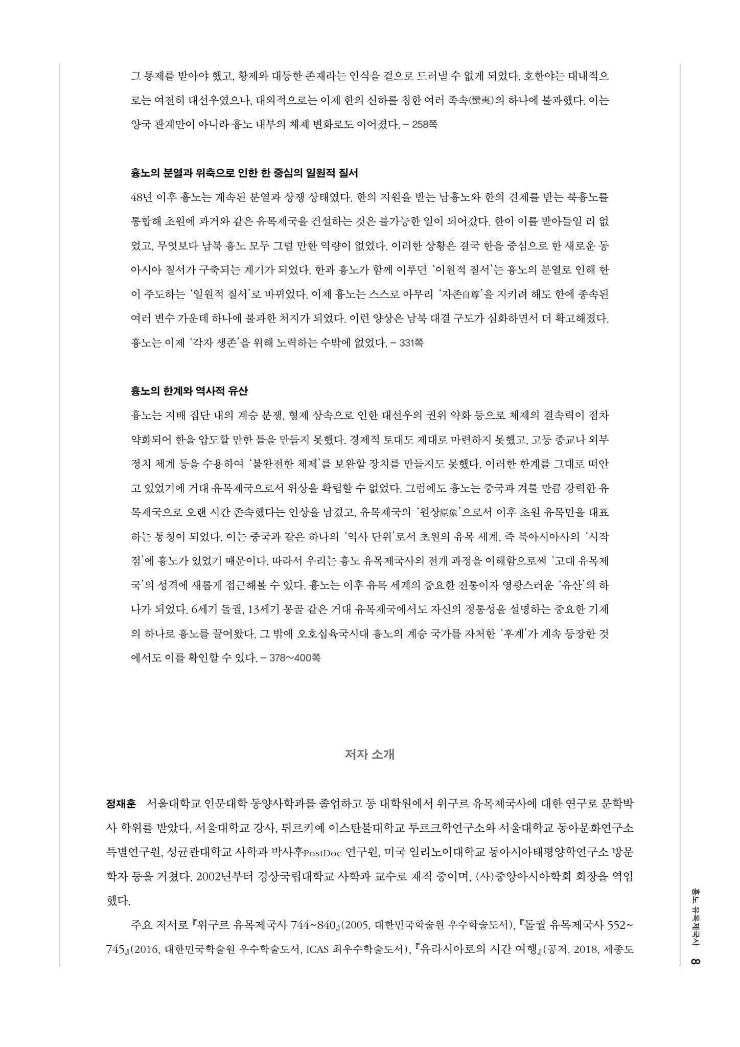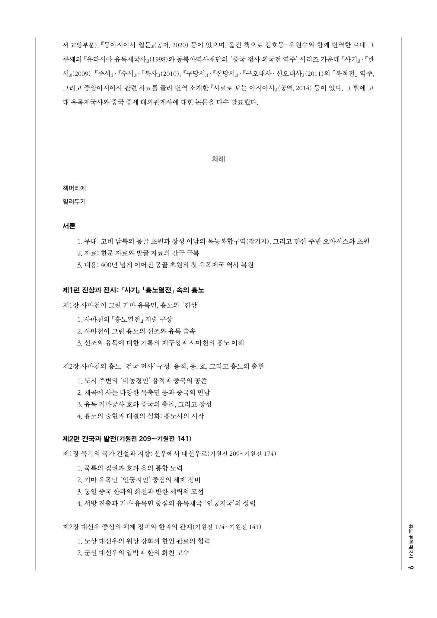 1998년 유라시아 유목제국사 고대 부분 번역을 시작으로, 2005년도 위구르 유목제국사(744~840), 2016년도 돌궐 유목제국사(552~745), 그리고 2023년 흉노 유목제국사(기원전 209~216)를 내놓게 되었습니다.