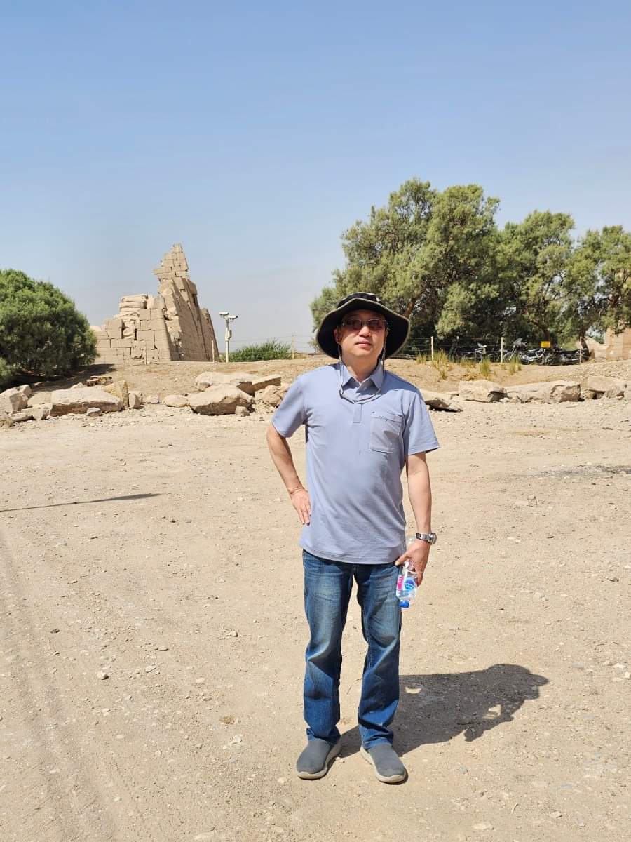 사진 설명: 제 뒤로 앞으로 무너져 내리고 기울어진 신전 탑문을 보실 수 있습니다. 람세스 2세는 3,200년 뒤 지구 반대편 동아시아 전문가들이 자신이 세운 신전의 탑문을 복원하기 위해 방문할 것이라는 사실을 꿈에라도 예상했었을까요?