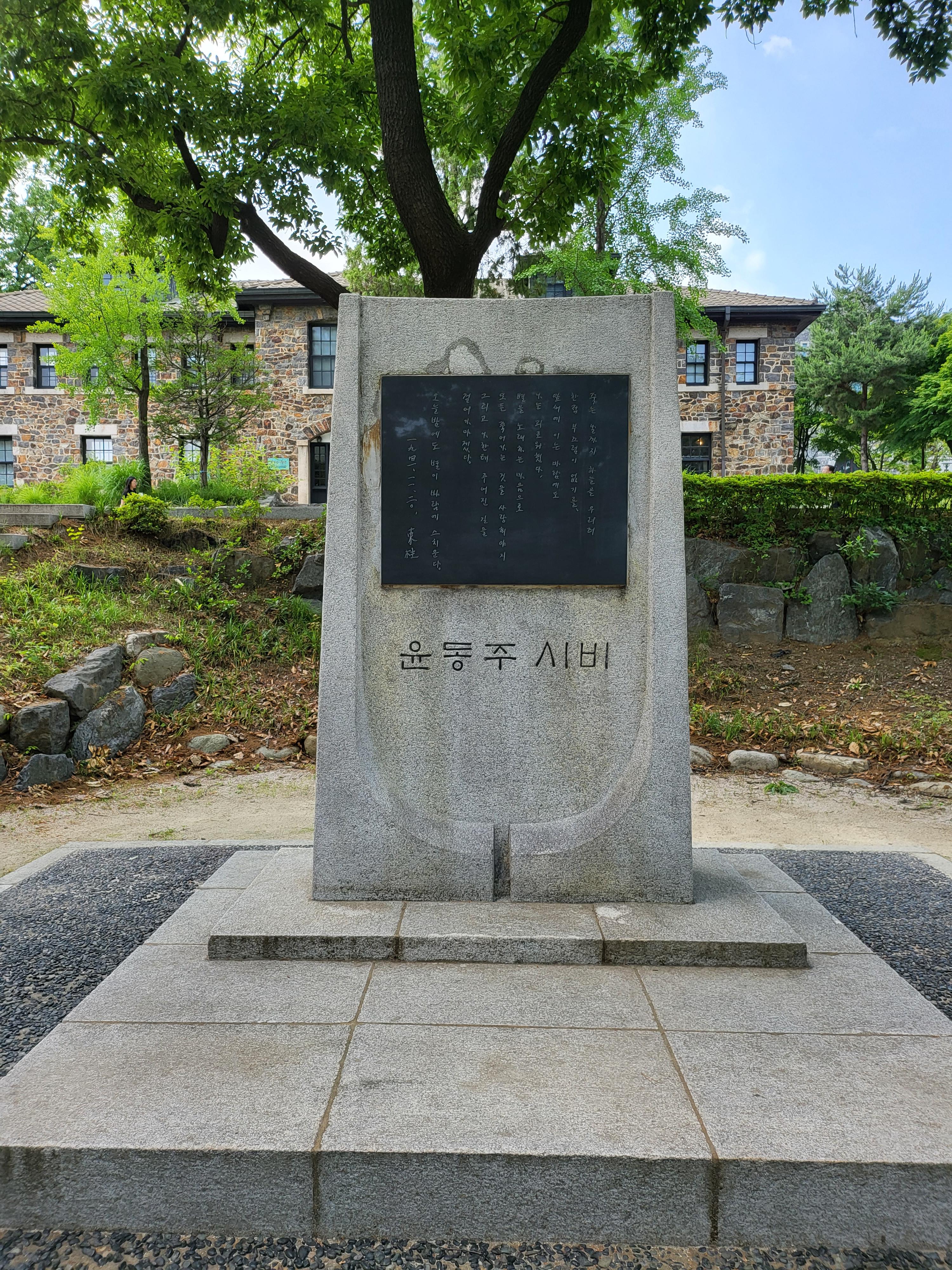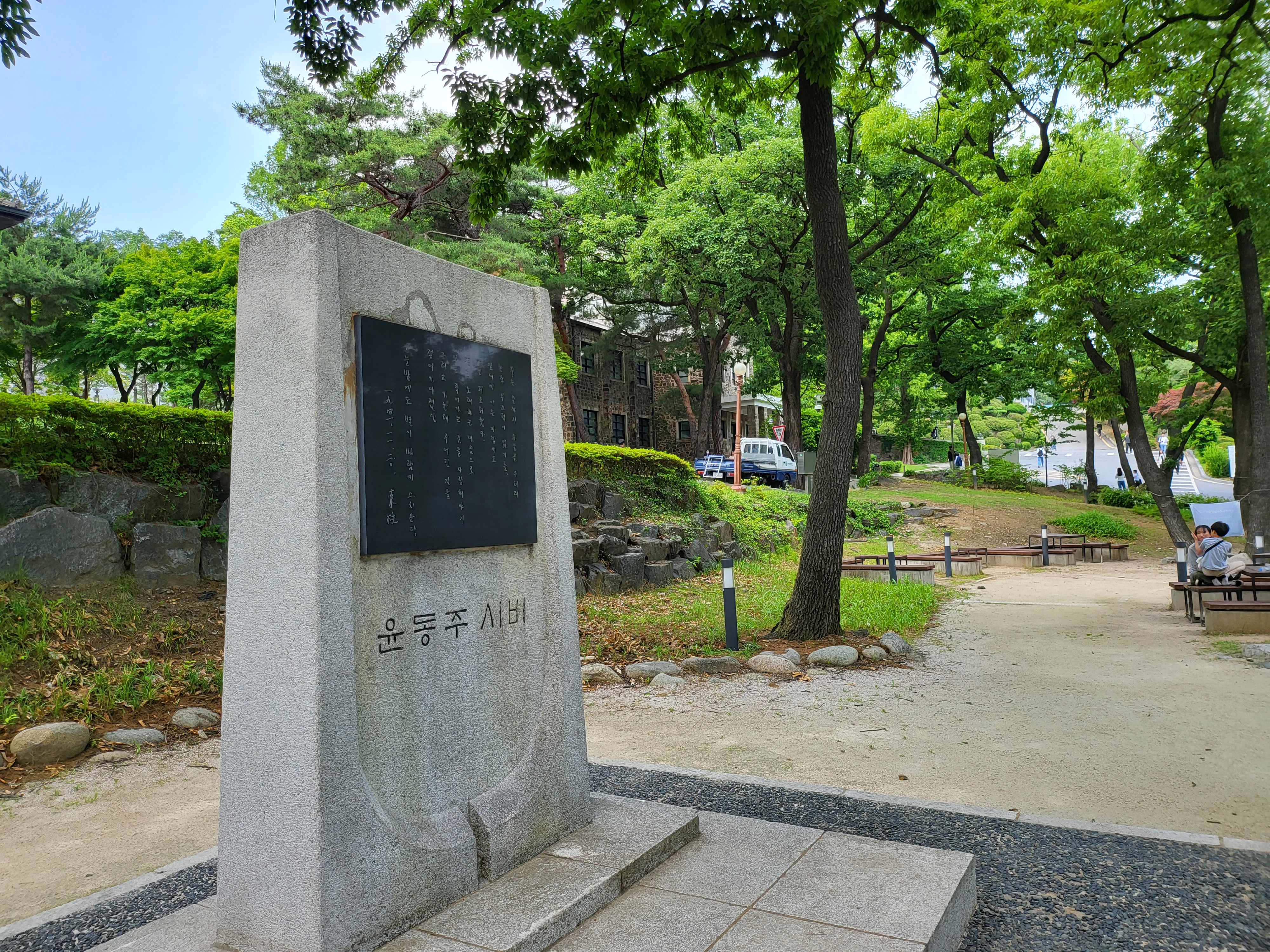 핀슨관 전면 경사 언덕은 시비 등 기념 조형물과 함께 윤동주 문학 동산으로 조성되어 있다.
