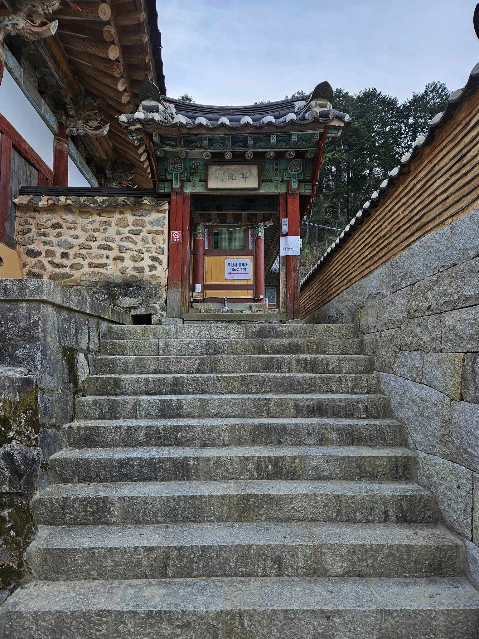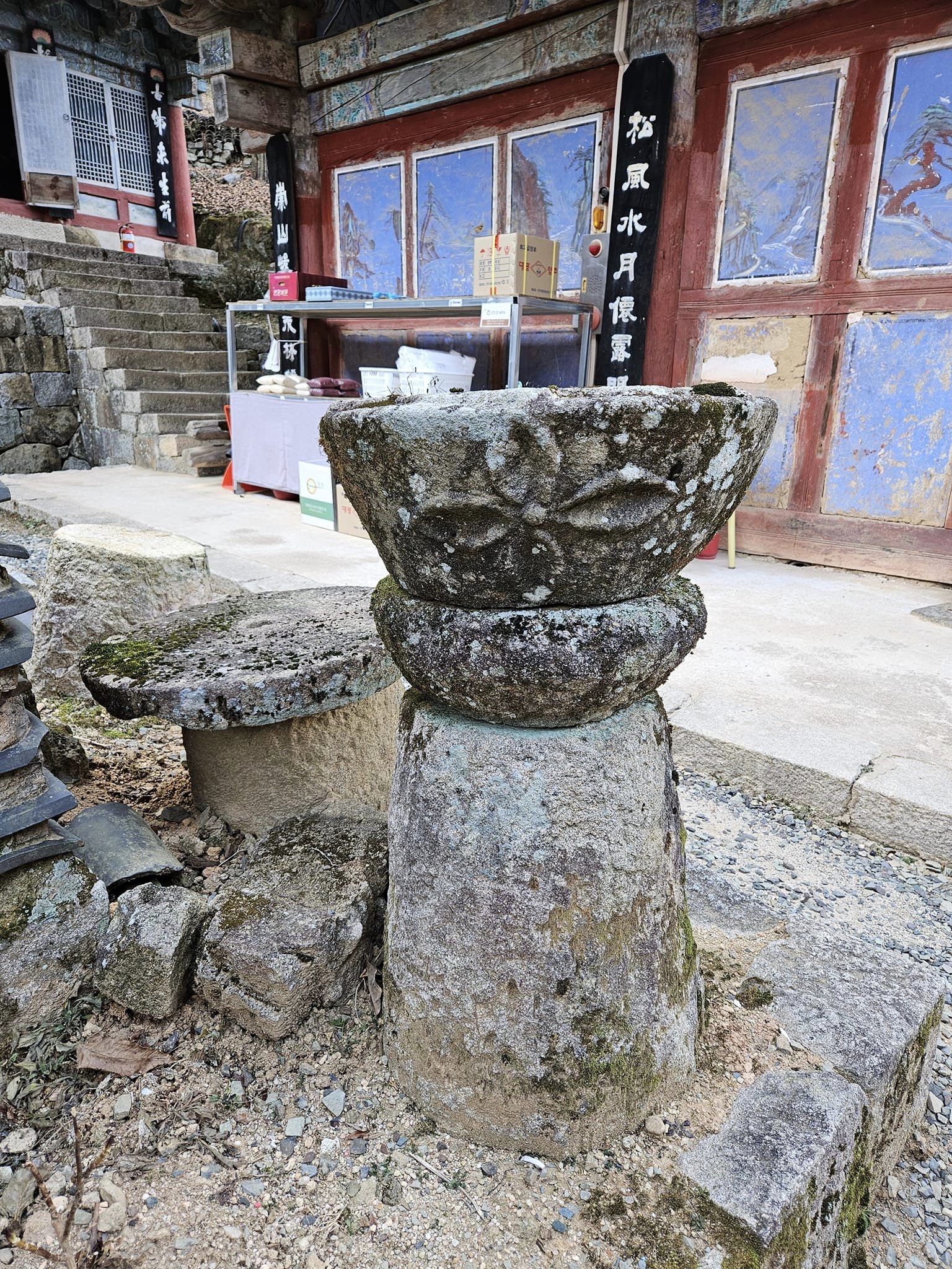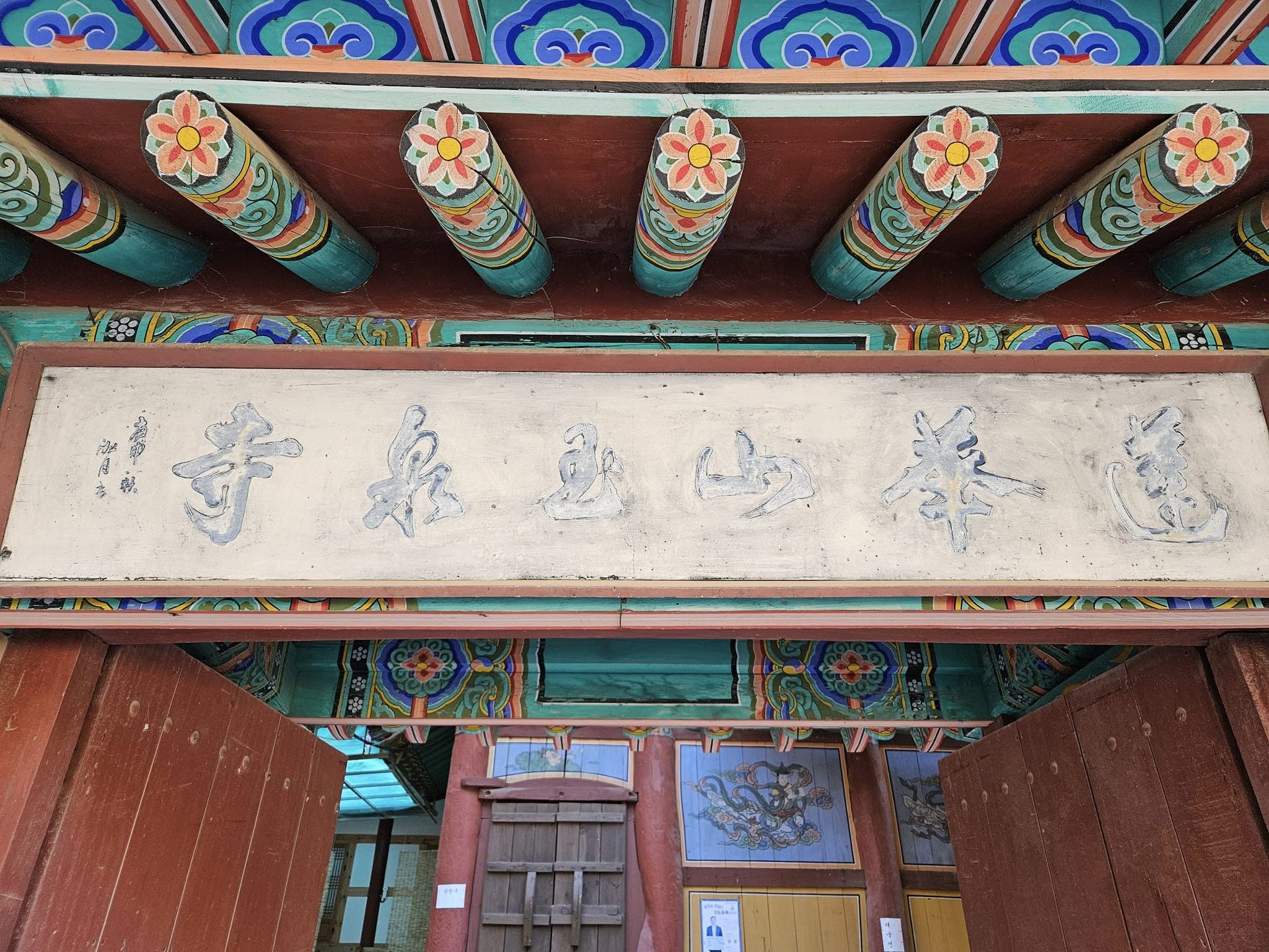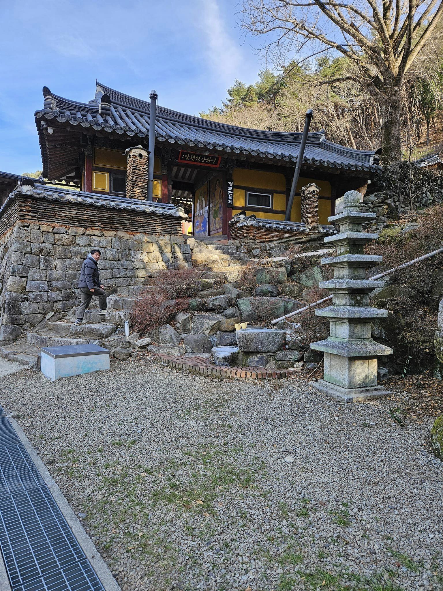 차를 타고 산이 품은 들을 가로질러 이리저리 휘돌아 들어가니 어느새 주변 풍경은 산중이다. 길옆 절벽은 켜켜이 쌓인 퇴적암 더미들인데, 동짓날 다음 날이라 그런지 팥시루떡 생각이 문득 든다. 근대 부산 지역의 명필이요 그 자신 스님 출신이었던 청남 오제봉 글씨 일주문 현판 앞에서 사진 하나를 찍는다.