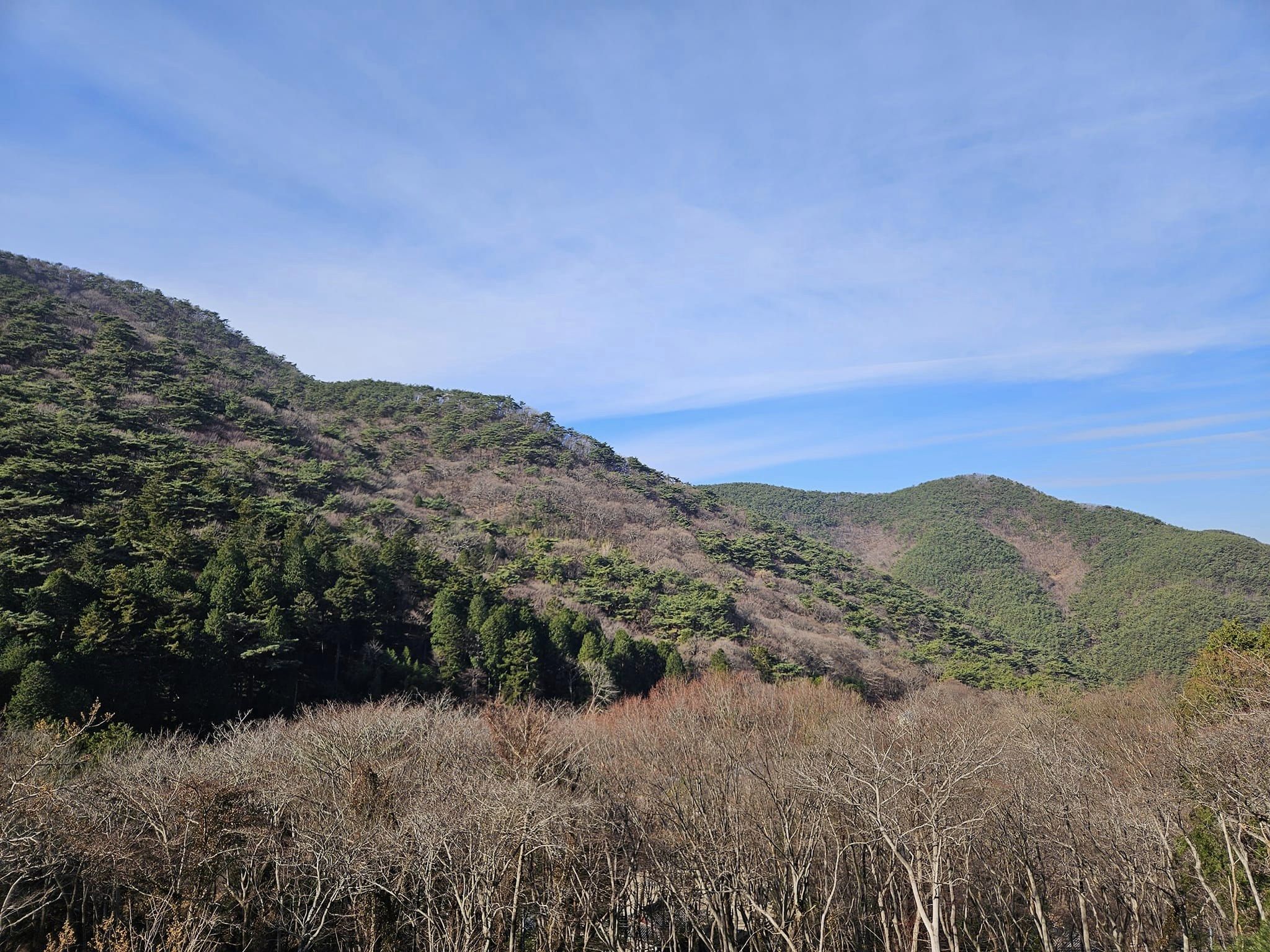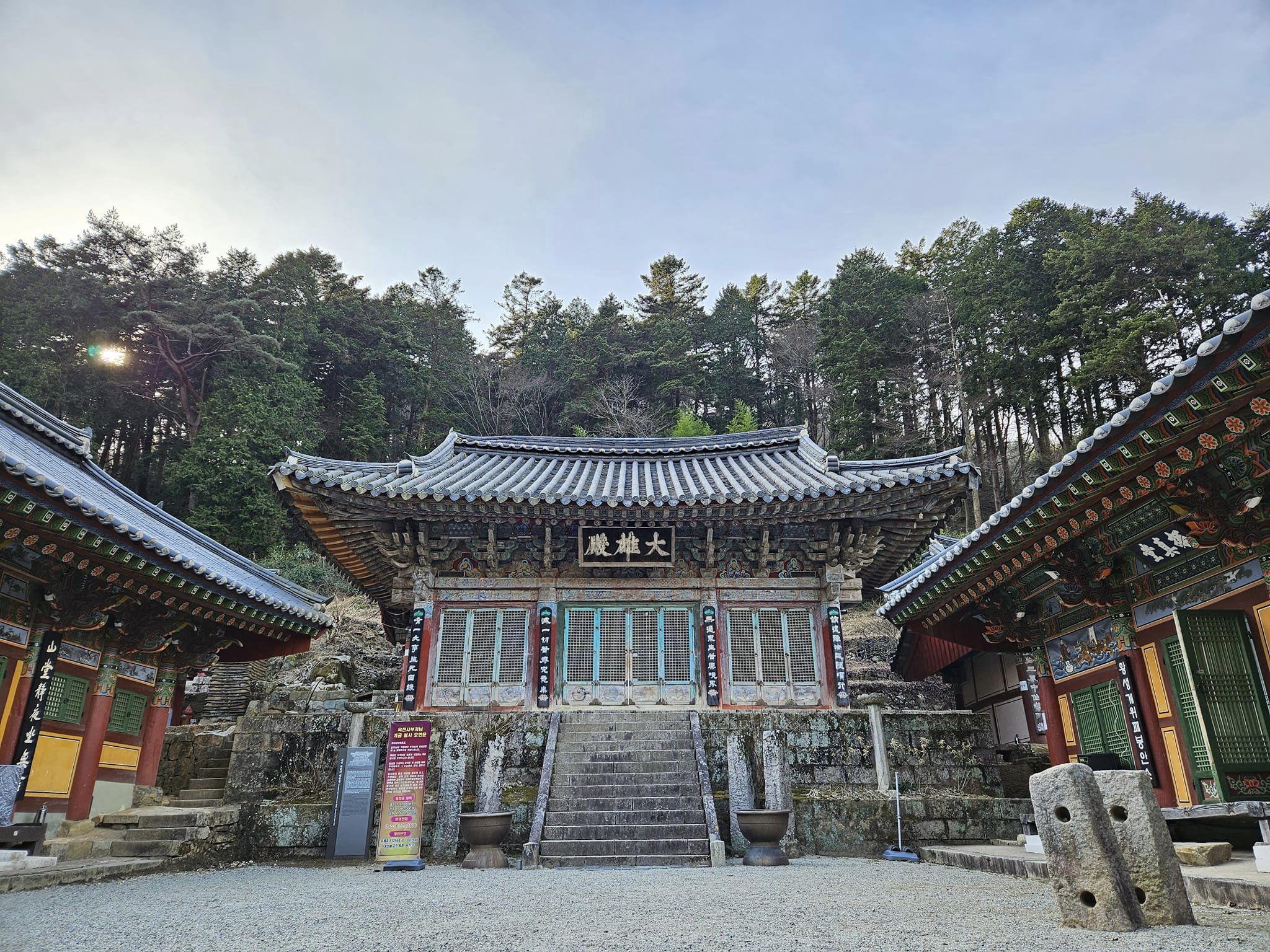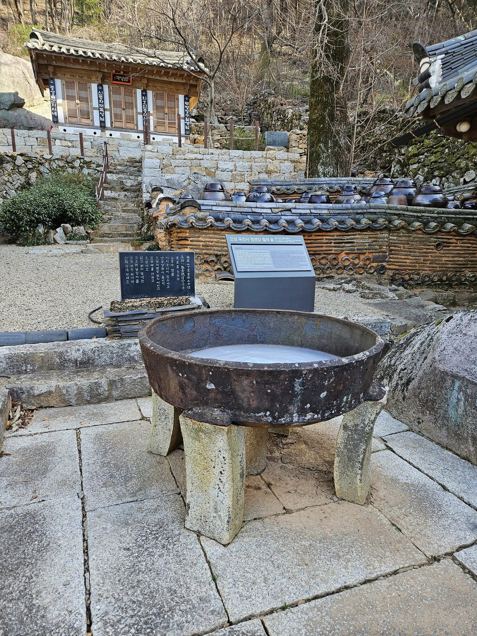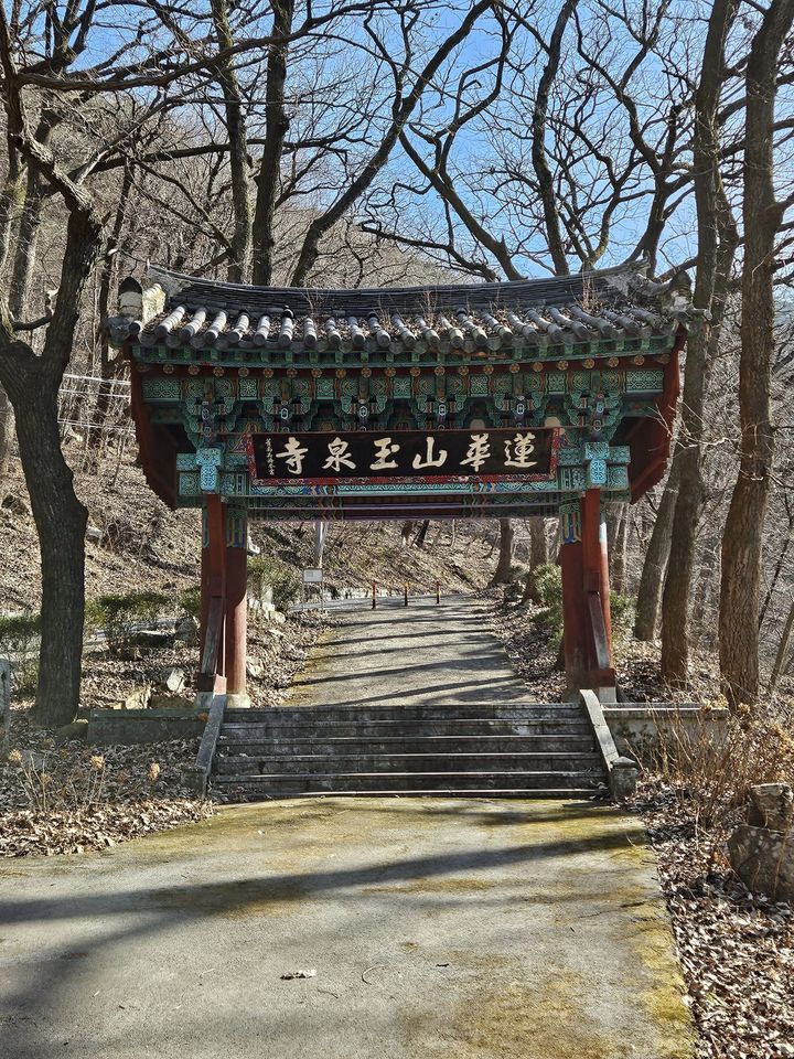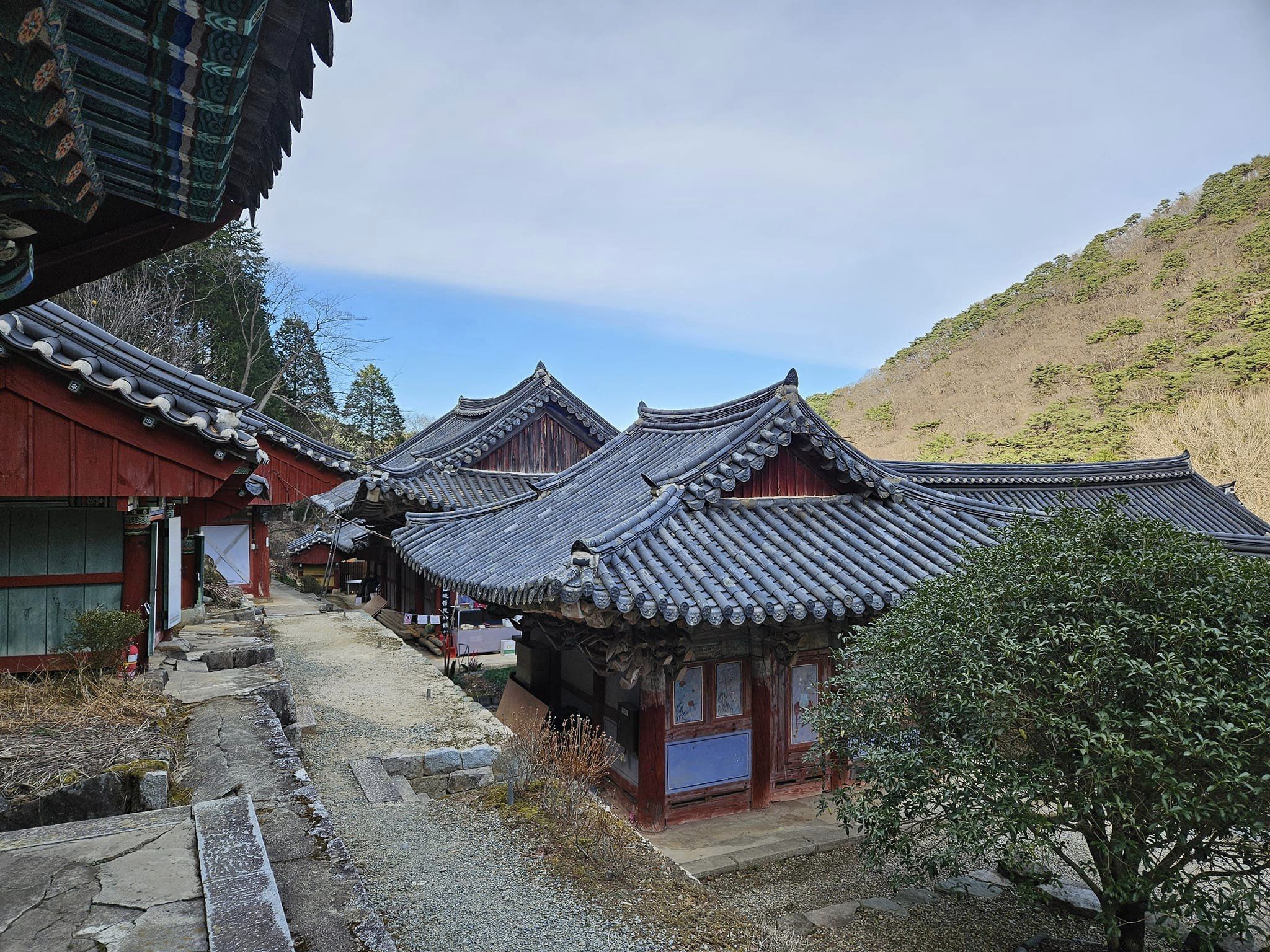 차를 타고 산이 품은 들을 가로질러 이리저리 휘돌아 들어가니 어느새 주변 풍경은 산중이다. 길옆 절벽은 켜켜이 쌓인 퇴적암 더미들인데, 동짓날 다음 날이라 그런지 팥시루떡 생각이 문득 든다. 근대 부산 지역의 명필이요 그 자신 스님 출신이었던 청남 오제봉 글씨 일주문 현판 앞에서 사진 하나를 찍는다.