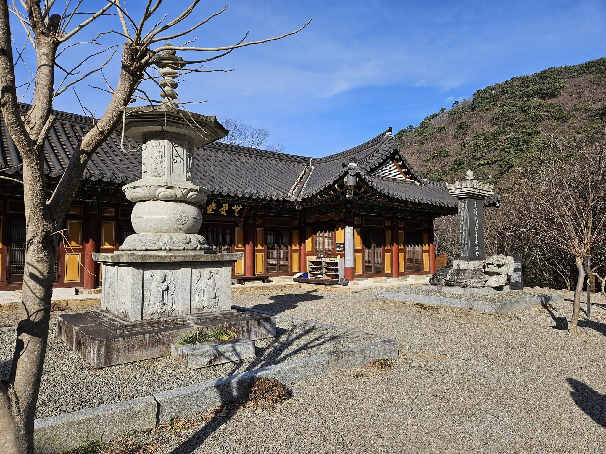 차를 타고 산이 품은 들을 가로질러 이리저리 휘돌아 들어가니 어느새 주변 풍경은 산중이다. 길옆 절벽은 켜켜이 쌓인 퇴적암 더미들인데, 동짓날 다음 날이라 그런지 팥시루떡 생각이 문득 든다. 근대 부산 지역의 명필이요 그 자신 스님 출신이었던 청남 오제봉 글씨 일주문 현판 앞에서 사진 하나를 찍는다.