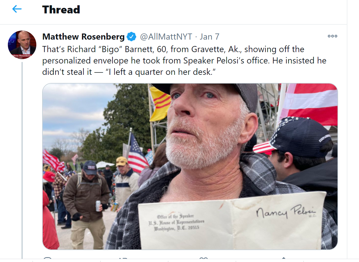 캐티톨 Capital로 쳐들어간 또라이 트럼프 지지자 중에서 아칸사 출신 리처드 바넷 Richard Barnett이라는 60대 뇐네가 저 짓거리를 했다는데, 캬! NBC 방송 보도 제목이 웃긴다.