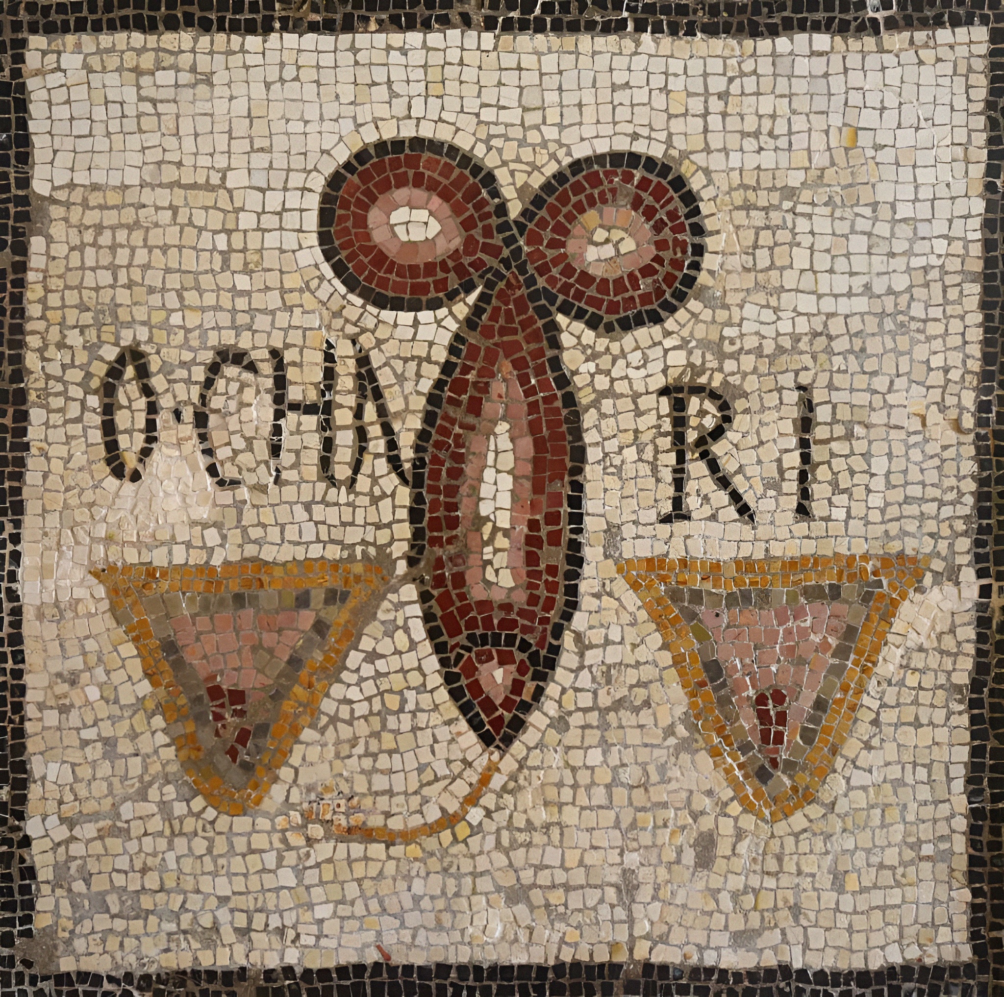 두 개 삼각형 암컷 거시기 사이로 누가 봐도 부랄스인 알맹이 두 개를 부착한 물고기 모양 거시기가 관통한 모습을 형상화한 아포트로픽 모자이크 apotropaic mosaic 다.