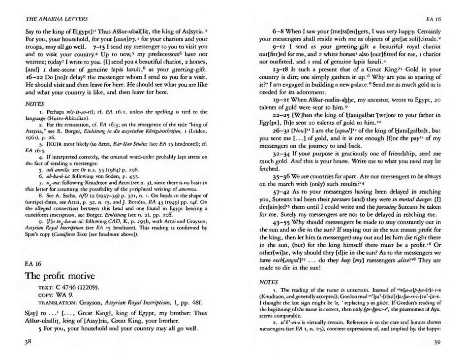 "이런 것이 위대한 왕이 [보낼 만한] 선물이오? 당신 나라에는 금이 먼지와 같고 긁어 모으기만 하면 되오. 그런데 왜 당신은 그렇게 인색하게 구시오? 나는 지금 새 궁전을 짓고 있소. 그 곳을 장식하는데 필요한 금을 내게 충분히 보내 주시오." (EA 16, 13-18; Moran 1992, 39)