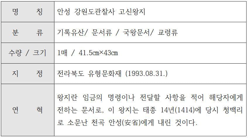 사간공 “안성安省 강원도관찰사江原道觀察使(현 도지사?) 고신告身 왕지王旨(전북특별자치도 유형문화재 제143호)”다.