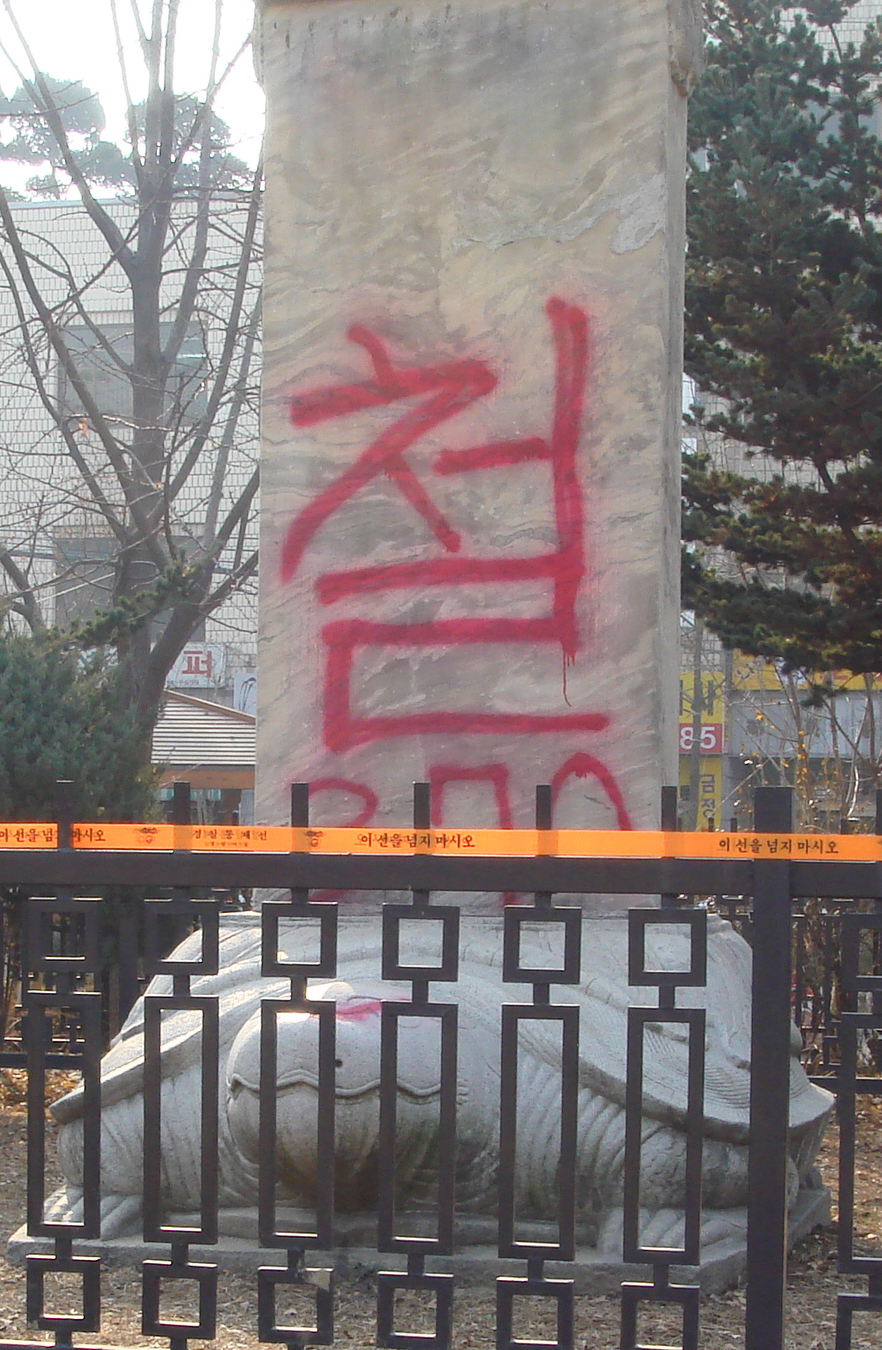삼전도비 사건이란 무엇인가? 2007년 2월 5일 오전에 송파구 석촌동 석촌호숫가로 옮겨진 사적 101호 삼전도비三田渡碑가 뼁끼칠이 되어 훼손됐다는 신고가 경찰에 접수된다. 이 비석에는 붉은 페인트로 '철거 370'이라고 글자가 아주 큼지막했다.