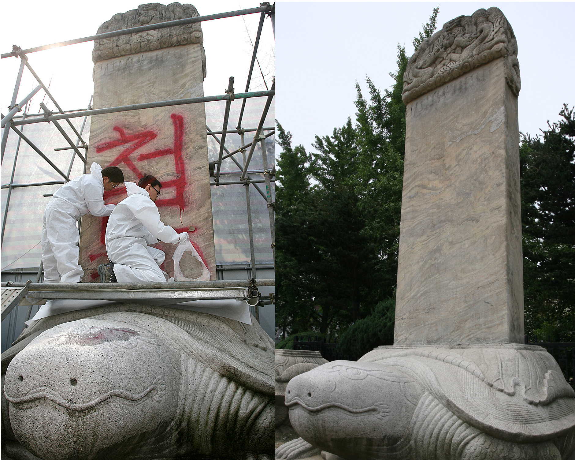 그렇다면 이 짓거리는 어떤 놈이, 무슨 목적으로 했던가? 범인이 같은달 말에 송파경찰서에 붙잡혔는데, 경찰은 문화재보호법 위반을 적용해 백모 씨 다른 당시 서른아홉살 남성을 체포하고는 27일 구속영장을 신청했다.