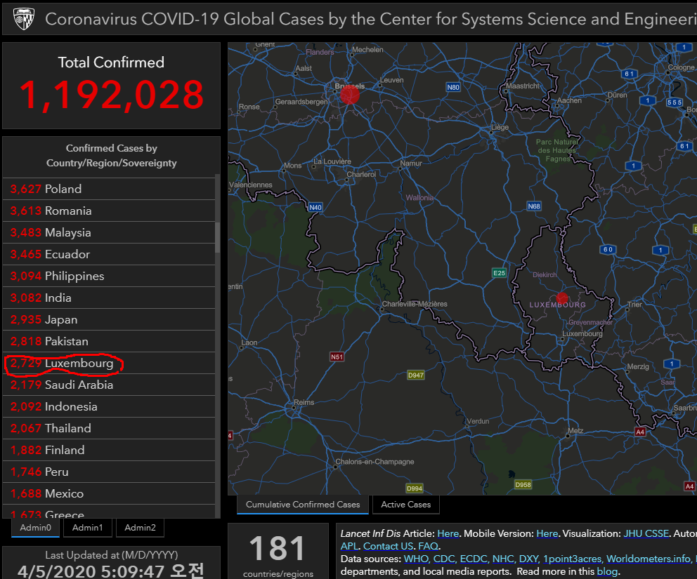 요새 자주 들르는 존스홉킨스대학 코로나19 상황판이다. 한국은 이제 상위권에서 죽죽 미끄러져 찾기도 힘든 형편이 되었지만, 그래도 그 밑으로 죽죽 내리다가 저 룩셈부르크 Luxembourg 에 물끄러미 눈알이 꽂힌다. 저 코딱지 만한 나라가 지금 현재 확진자가 2천729명이라니???