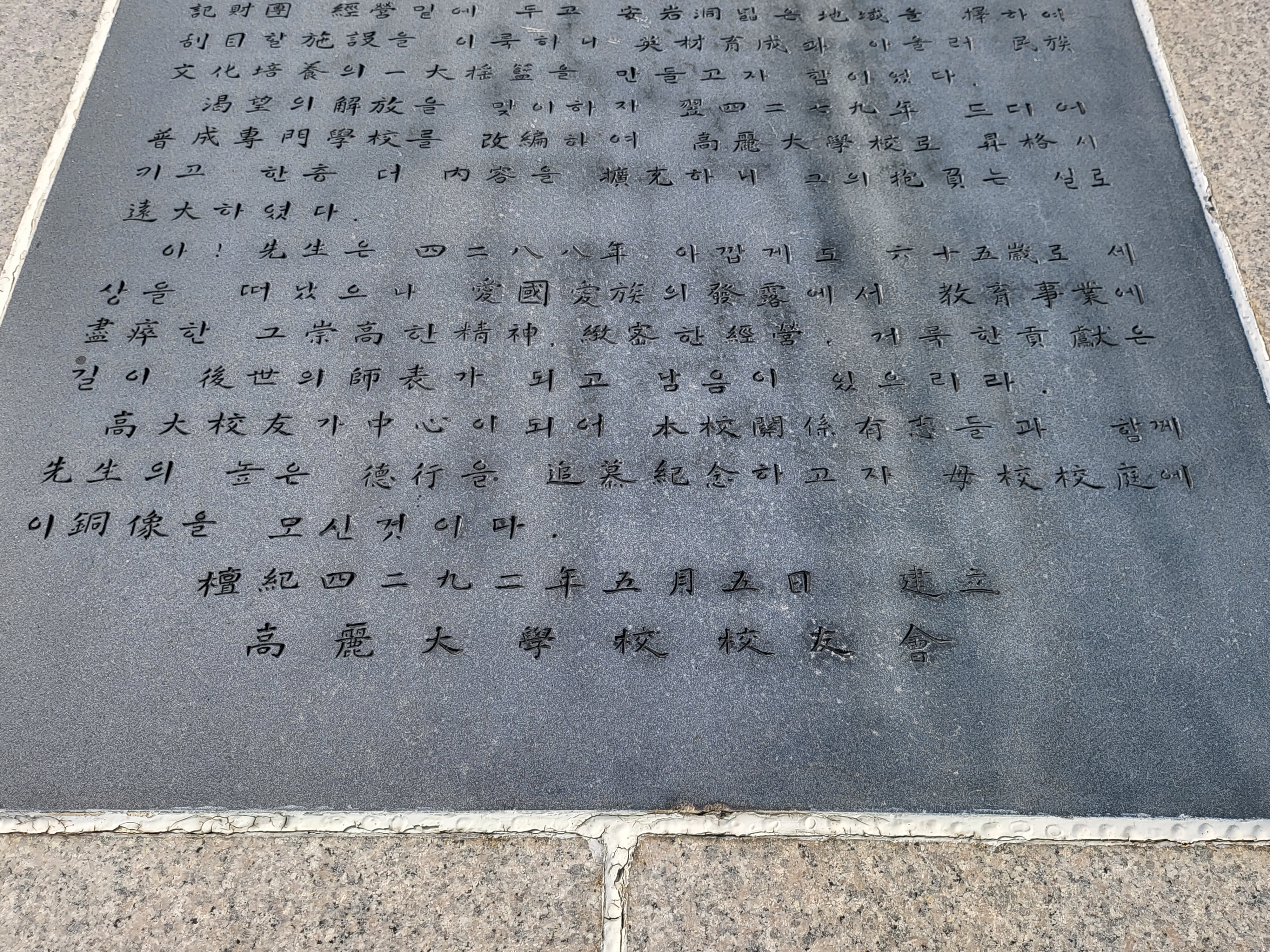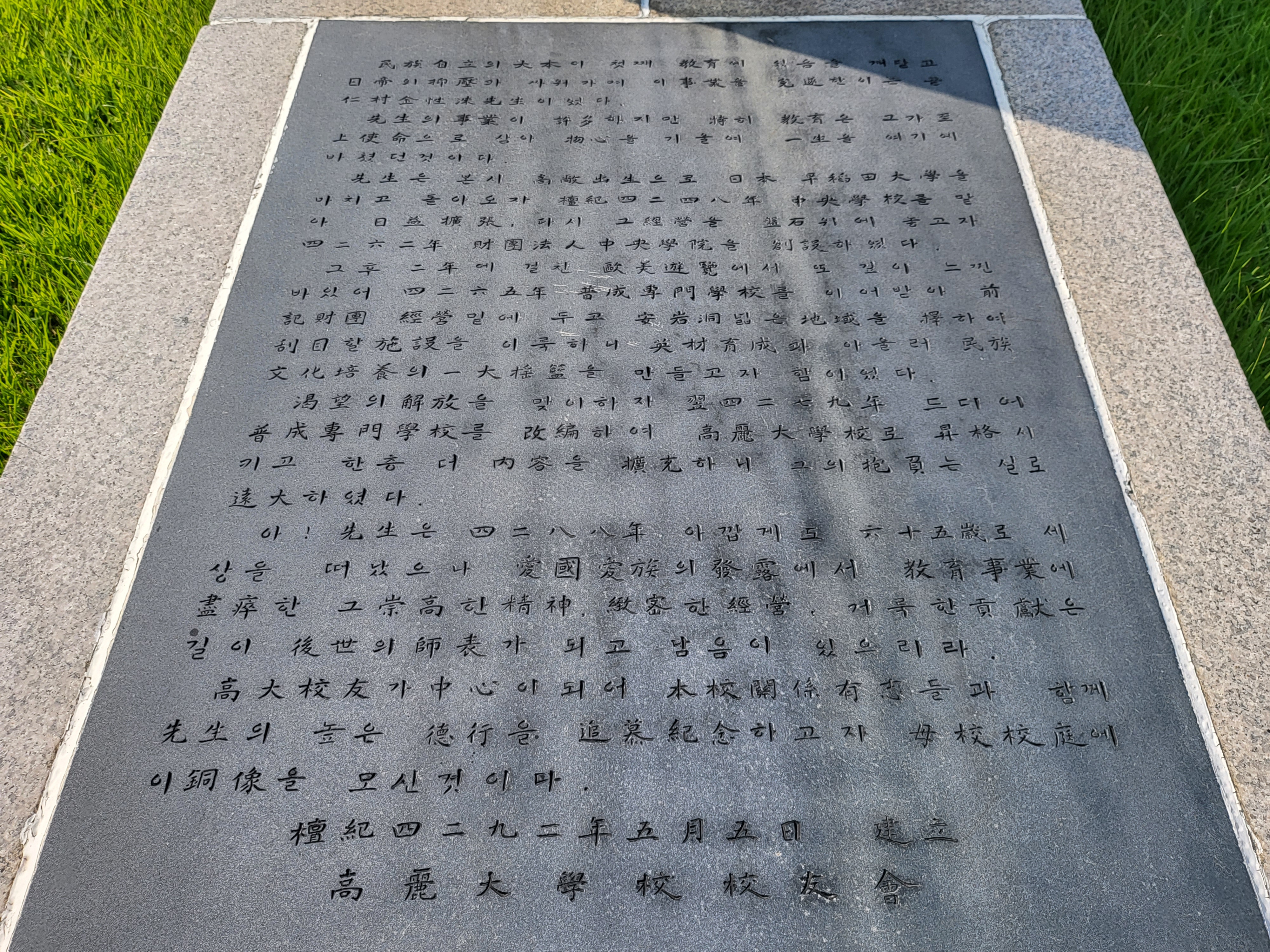 고대교우가 중심이 되어 본교 관계 유지들과 함께 선생의 높은 덕행을 추모기념하고자 모교 교정에 이 동상을 모신 것이다.