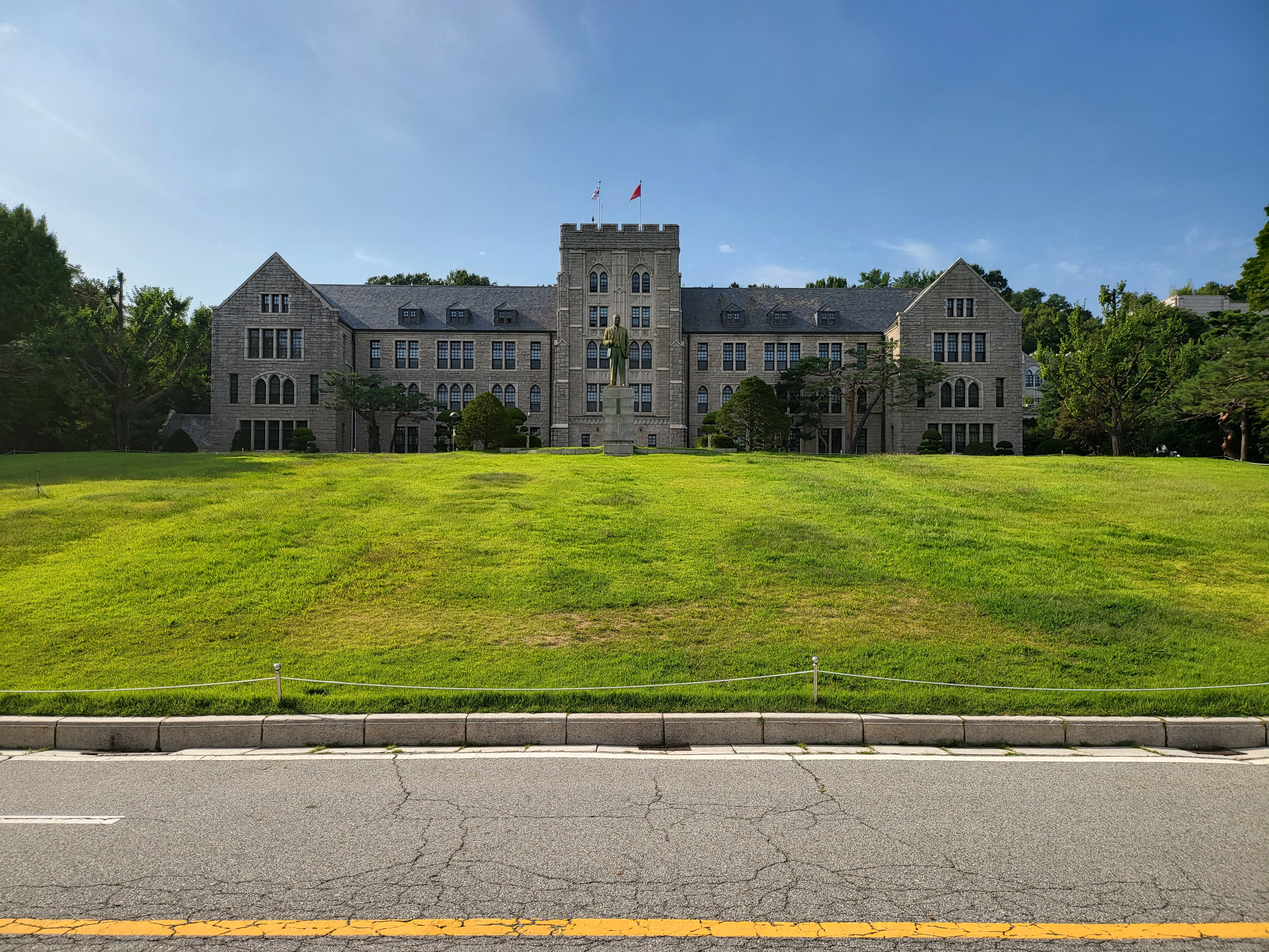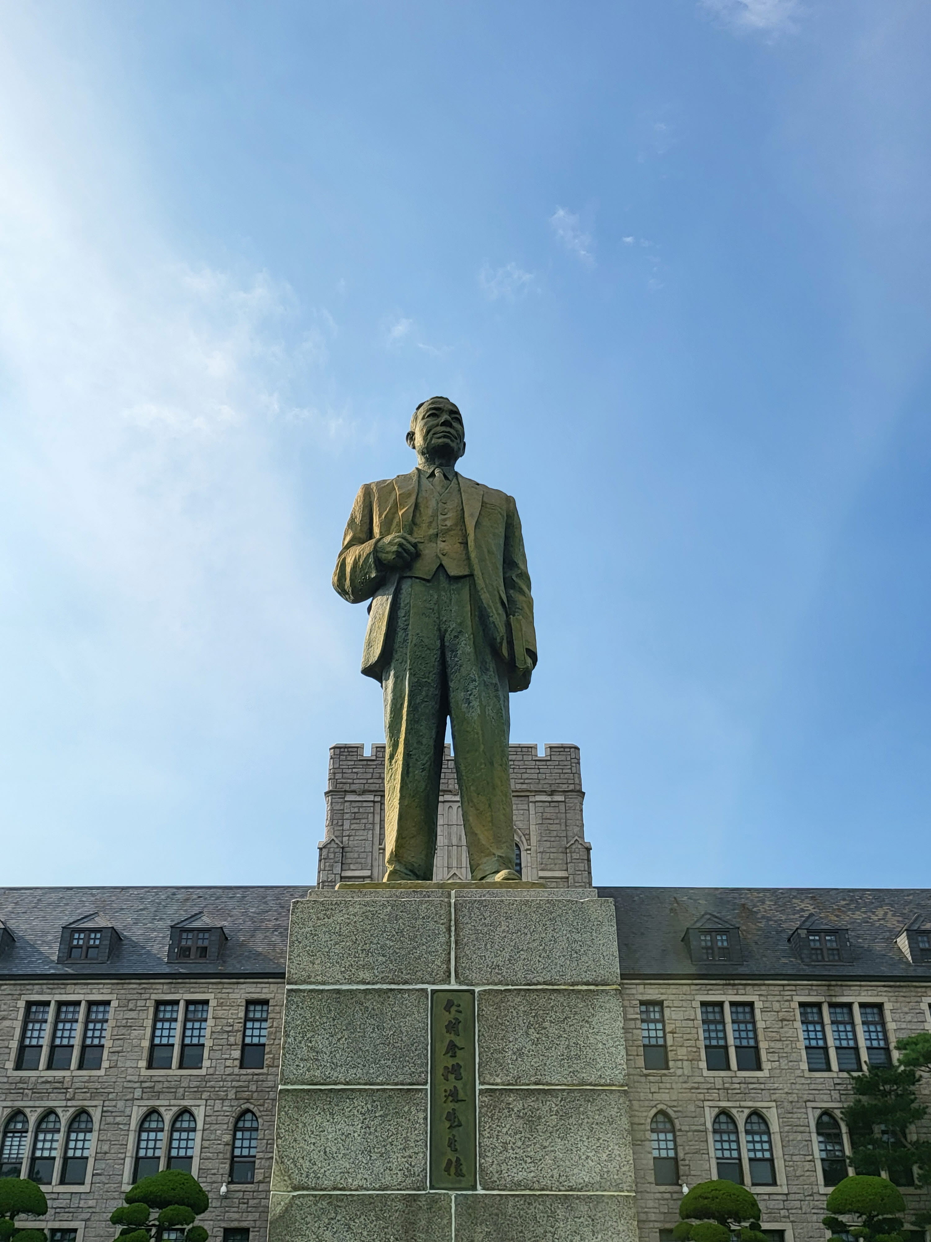 고려대 안암캠퍼스 본관 앞마당에는 중앙학교와 보성전문학교를 인수하고 고려대를 창립한 인촌仁村 김성수金性洙(1891~1955) 동상이 본관을 등지고 남면한 입상立像 형태로 섰으니, 전면에서 바라보면 저 모습이고