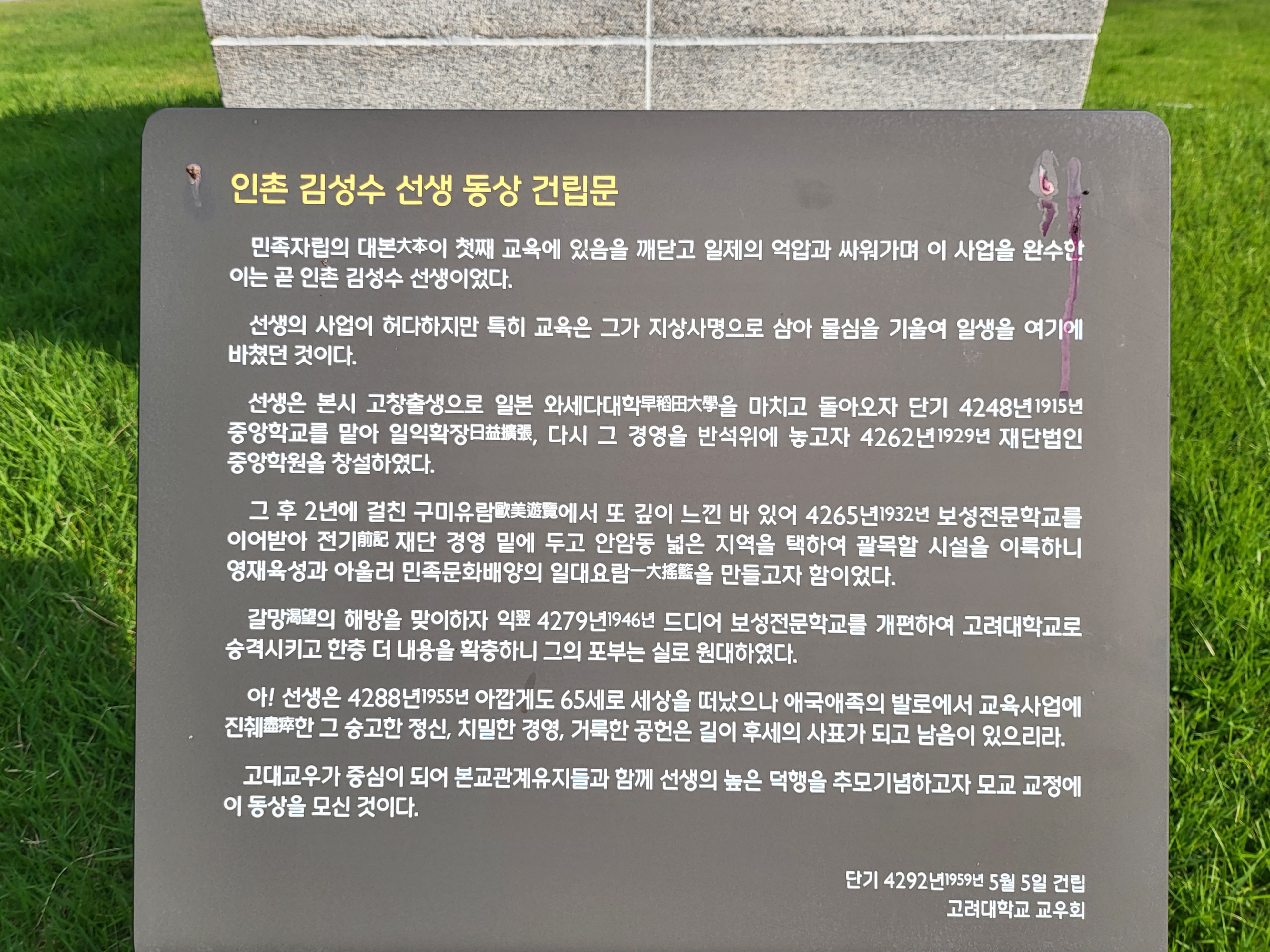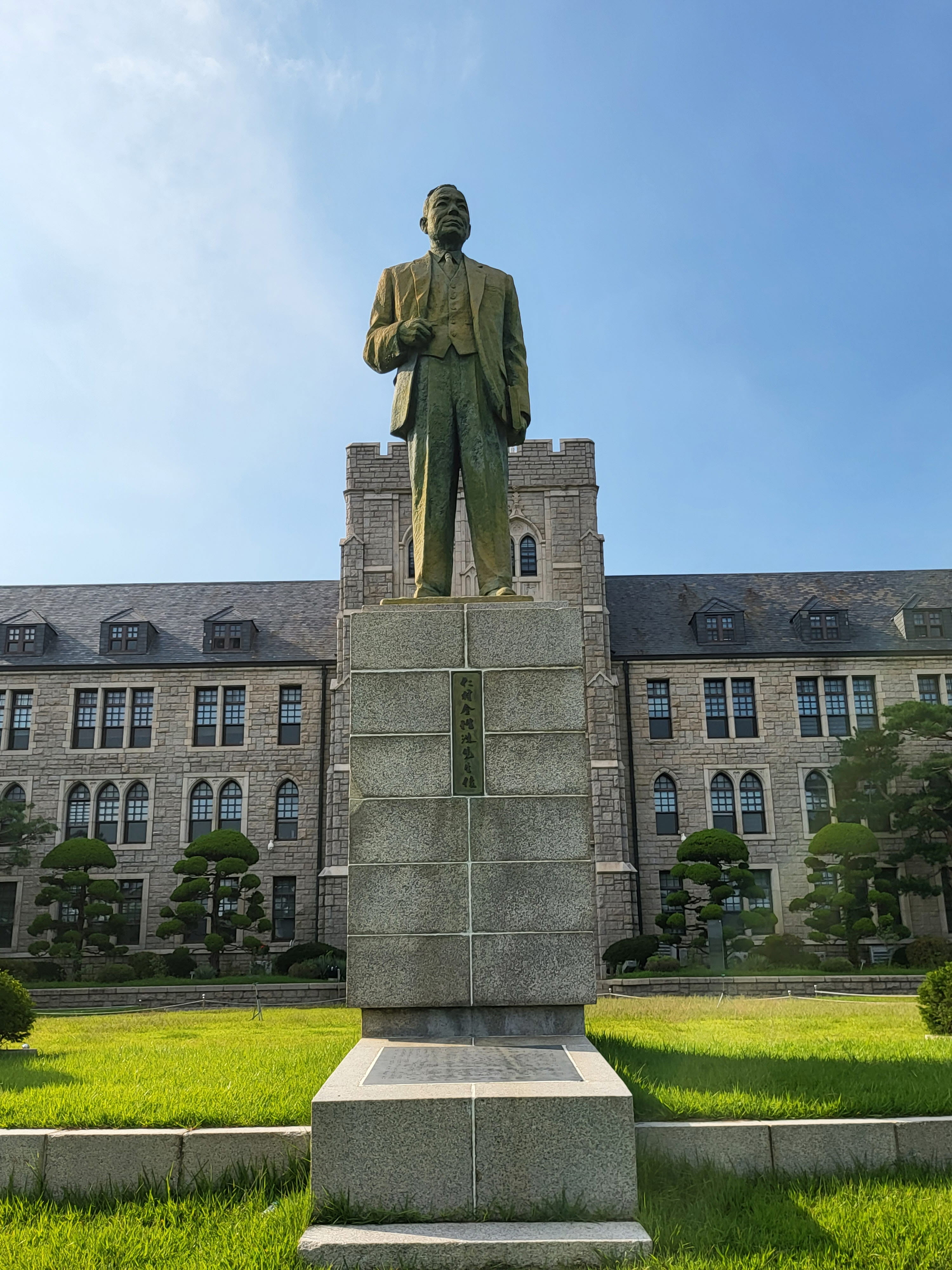 고려대 안암캠퍼스 본관 앞마당에는 중앙학교와 보성전문학교를 인수하고 고려대를 창립한 인촌仁村 김성수金性洙(1891~1955) 동상이 본관을 등지고 남면한 입상立像 형태로 섰으니, 전면에서 바라보면 저 모습이고