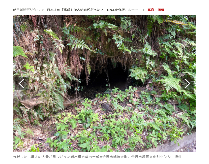 가나자와시金沢市에서 발견된 1500여 년 전 고분시대 인골 DNA 분석에서 조몬인縄文人이나 야요이인弥生人에게는 아닌 현대 일본인에게서 발견되는 동아시아인 특유의 유전적 특징이 발견됐다. 일본인 뿌리는 토착 조몬인과 대륙에서 도래한 야요이인 혼혈설이 유력하지만, 더욱이 대륙으로부터의 도래渡來가 진행된 고분시대에 이르러 고분인古墳人이 등장함으로써 현대로 이어지는 조상집단이 처음 탄생했음을 시사하고 있다.