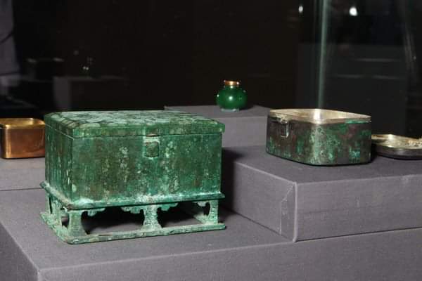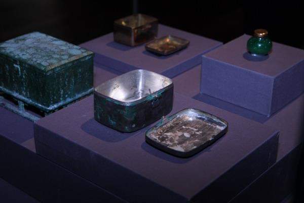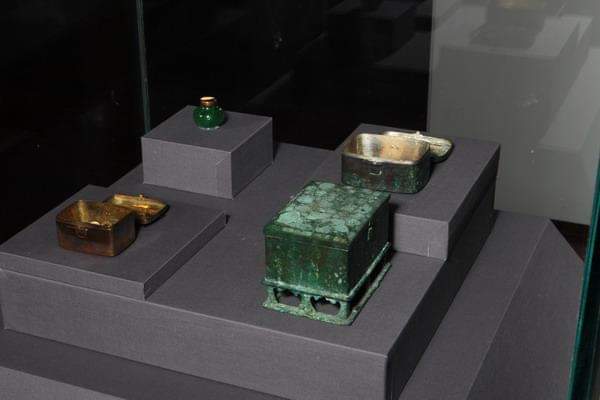 The Buddhist relics were preserved in three containers of gold, silver, and gilt-bronze, which were placed one inside the other in this order. Ornaments accompanying the reliquary were an amethyst jewel, a glass bead, a jade bead, a silver coin, an iron mirror with gilt-bronze back and a bronze bell.