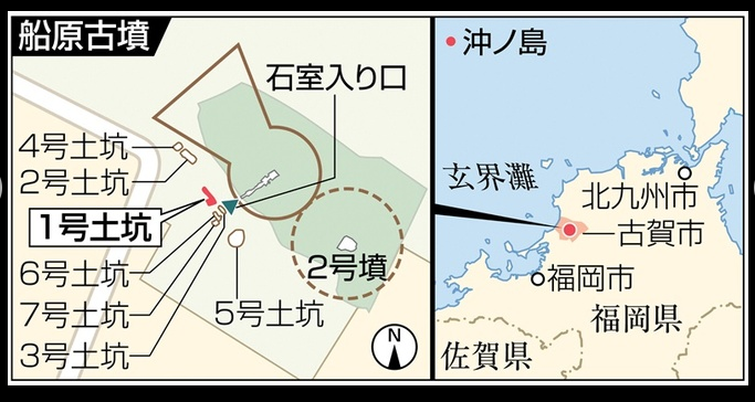 船原古墳の基本情報 発見の経緯 平成25年3月、古賀市谷山のほ場整備に伴う谷山北地区遺跡群の発掘調査で、古墳時代の馬具を多量に納めて埋めた土坑が発見されました。その後の調査で、