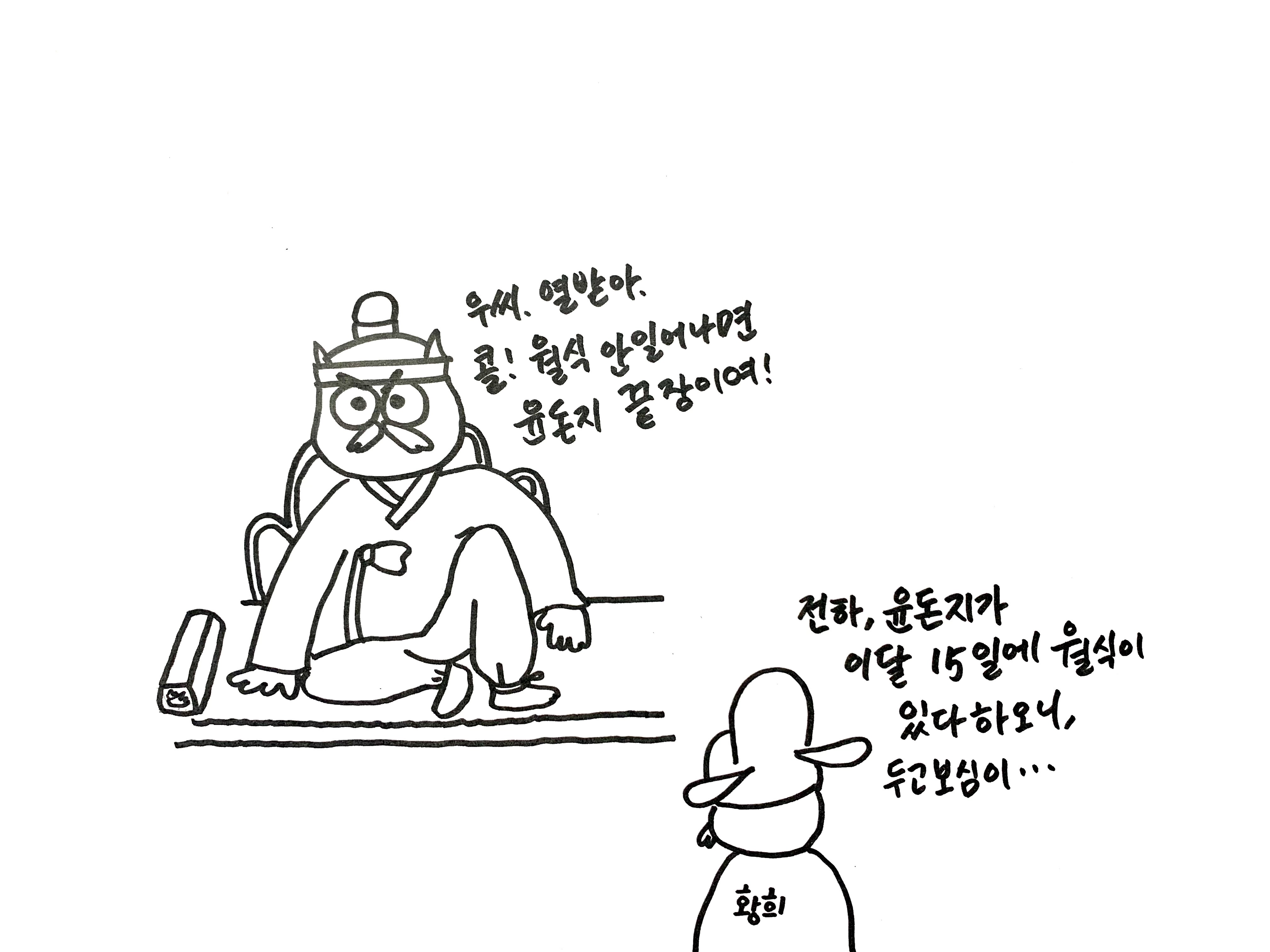 하니 황희가 참 주군을 잘 섬기는 신하라, 두고 봅시데이, 돈지가 이달 15일에는 월식이 있다 캤응께 그거 보고 판단하이소 한다.