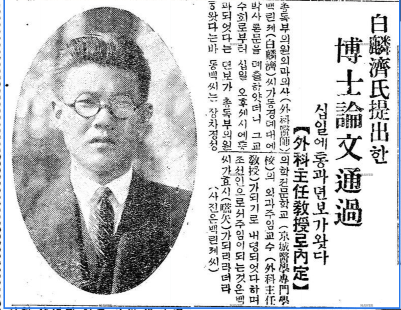 아래 신문기사를 보면 백인제 선생이 박사학위를 받던 당시의 상황을 볼수 있는데 선생이 학위를 받을 당시 그는 총독부의원의 외과의로 근무하고 있었다.