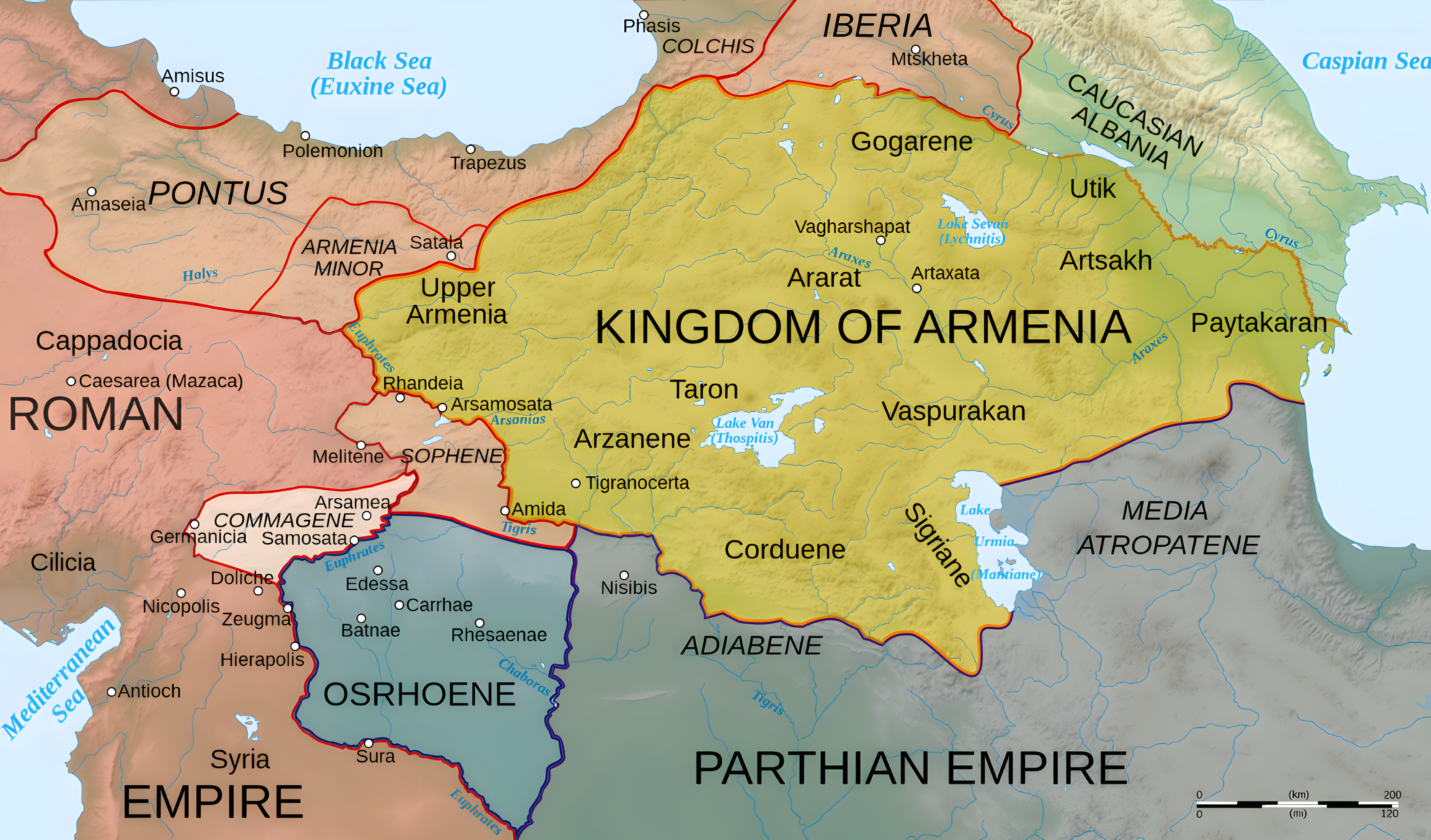 서기 50년 무렵, 아나톨리아 동부랑 이란고원 정치체 분포 양상을 보면 저래서 왼쪽 로마 제국과 오른쪽 파르티아 제국을 양쭉으로 삼아 그 사이에 아르메니아 왕국이 크게 똬리를 텄고 그 틈바구니에 소페네Sophene, 오스로에네Osrhoene가 있고, 그들보다 훨씬 작은 규모로 콤마네게가 숨도 제대로 못 쉼을 본다.