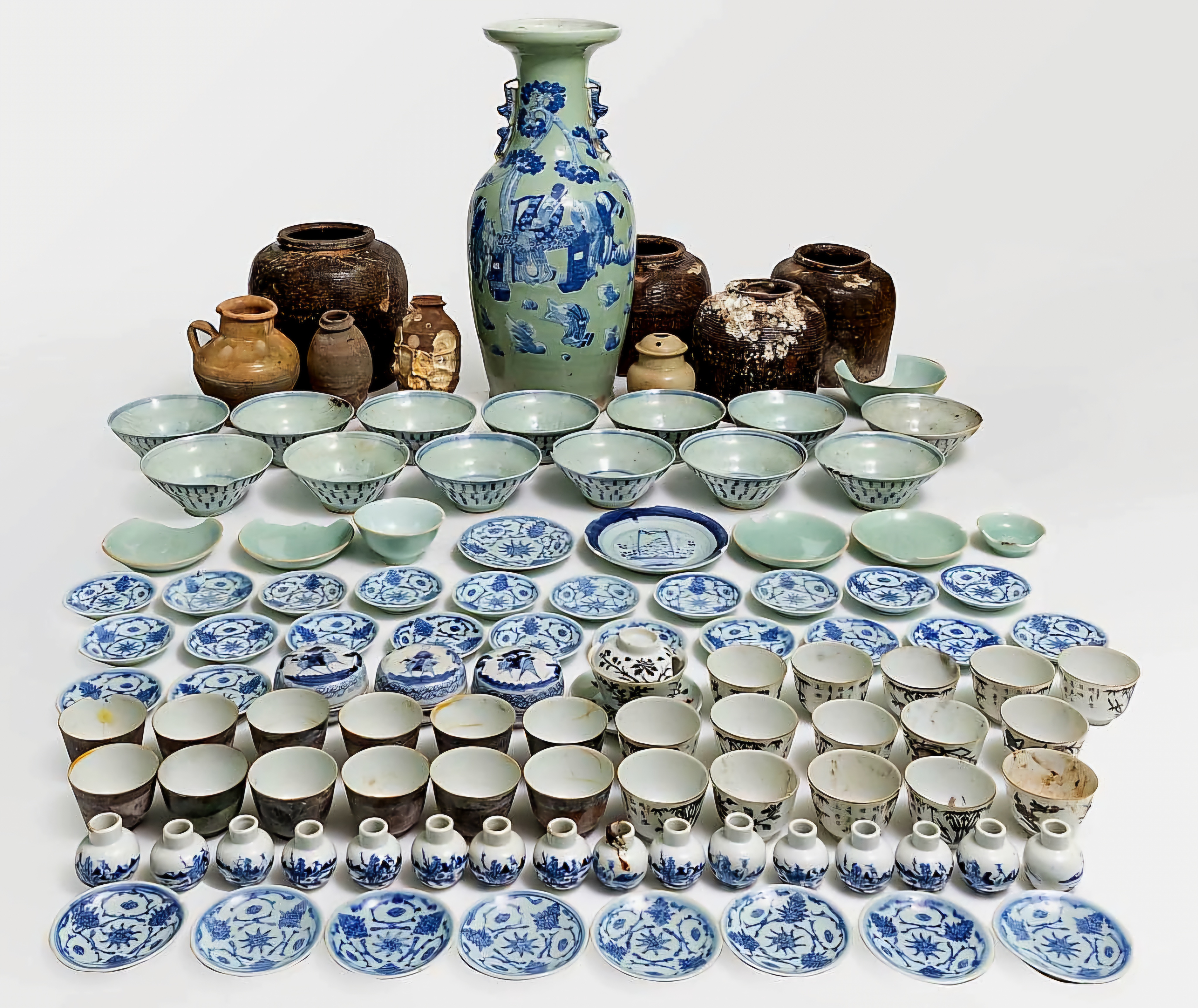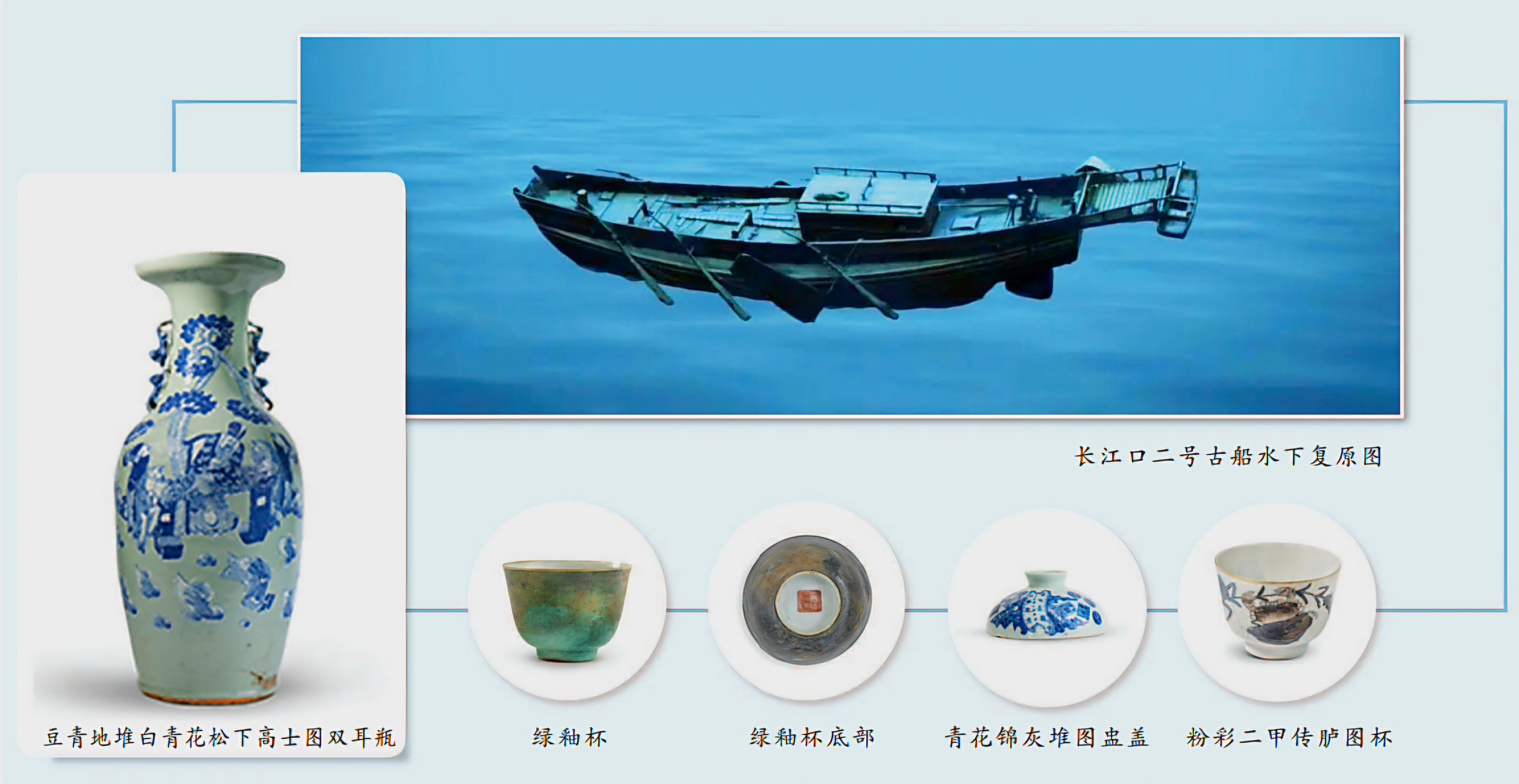 기초 정리작업에서 선박 안팎에서 439점 도자기를 건졌으니, 그 대부분은 경덕진요景德鎮窯 제품이라, 그 외에도 자사기紫砂器、월남越南 산 수연관水煙罐이 섞여 있었고, 묵서 「시태時泰」 목통木桶이 있으며,