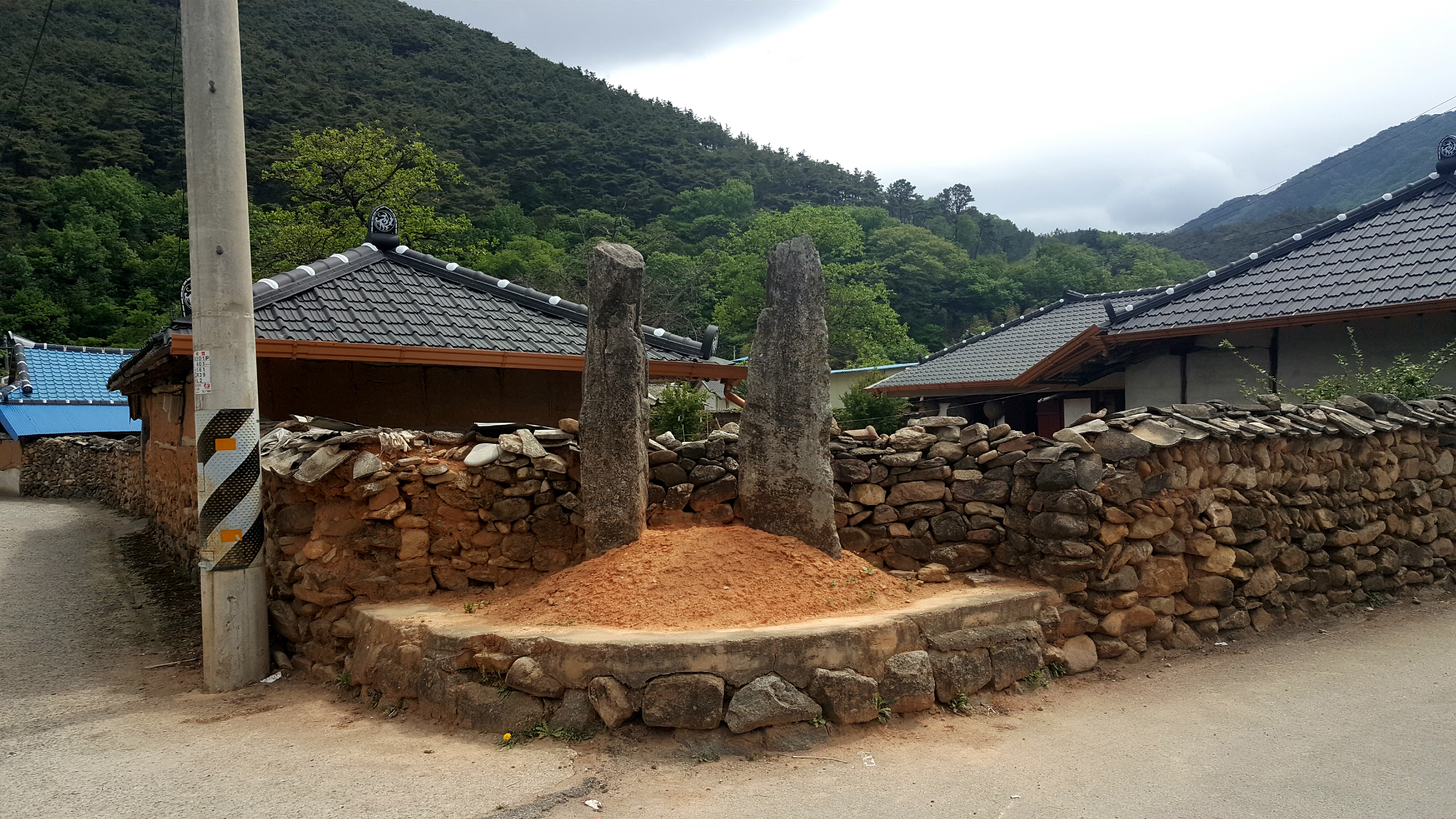 마을 입구 갈림길에 언뜻 당간지주처럼 보이는 돌기둥 두 개가 섰으니, 본래 어떤 데 썼는지는 모르겠다.
