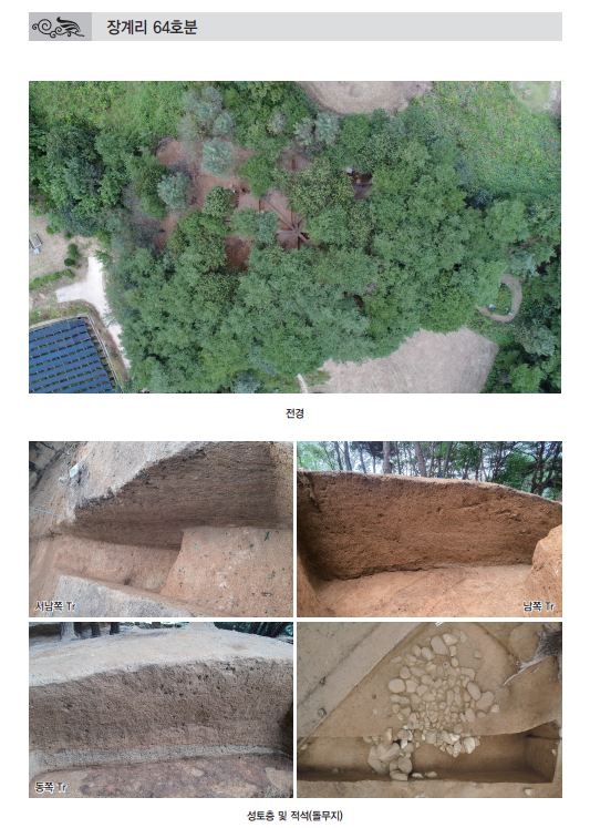 4. 64호분 성토층은 넓게 확인되며, 대부분 조사지역 기반토인 풍화암반토를 층층이 쌓았다. 정상부 1m 깊이에서 일부 소결토와 목탄이 함께 혼입된 층과 암갈색 사질점토층이 확인된다. 유물은 성토층에서 뚜껑 2점 등 토기편 약간이 확인되었다.