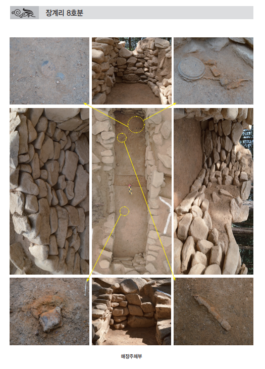 2. 장계리 8호분은 봉토 평면 형태가 동-서가 약간 긴 (타)원형이고, 매장주체부를 중심으로 남쪽에서 소형 석곽묘 4기와 옹관, 토광묘가 확인되어 8호분에 배장陪葬된 묘들로 추정된다. 8호분 축조방법은 매장주체부인 주석곽主石槨을 축조하고 1차적으로 석곽 위에 성토盛土를 하고 최종적으로 봉분을 조성한 것으로 보인다.